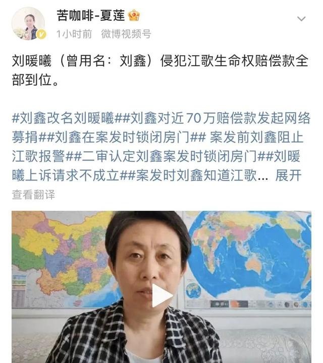 6月1日,江歌妈妈通过社交平台宣布,刘暖曦(曾用名:刘鑫)侵犯江歌生命权赔偿款69.6万元已全部执行到位,后续将把这笔钱捐出。据江歌妈妈在视频透露,法院共强制执行刘鑫4次。