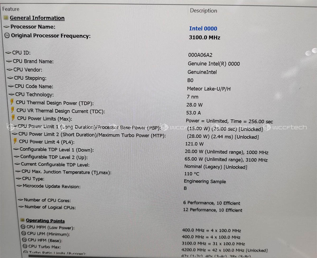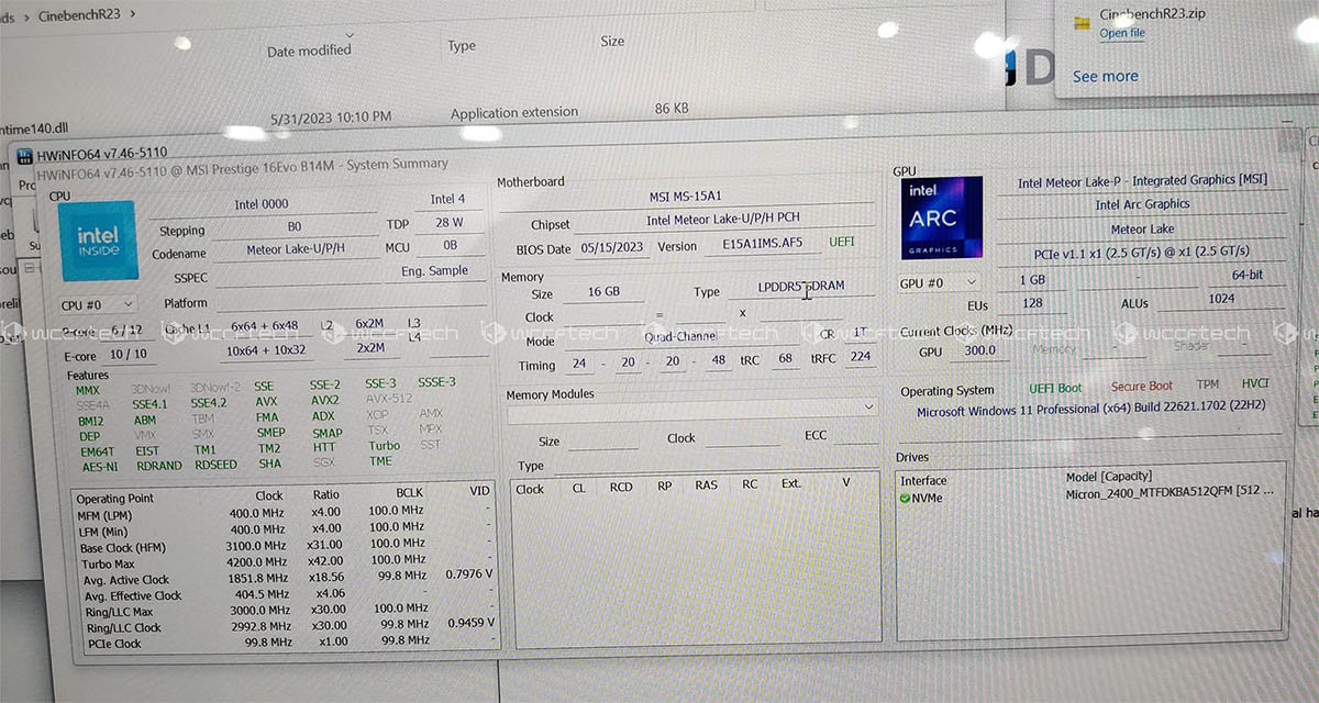 wccftech就在微星的展台上给这台机器装了HWINFO和Cinebench,从HWINFO检测出来的信息可以看出这处理器是一个Meteor Lake-P,有6个P-Core和10个E-Core,一共22个线程,根据此前泄露的信息,当中两个E-Core是在SoC模块里面的,而不是计算模块,由于是早期样品,所以CPU型号是0000,而TDP则是28W。