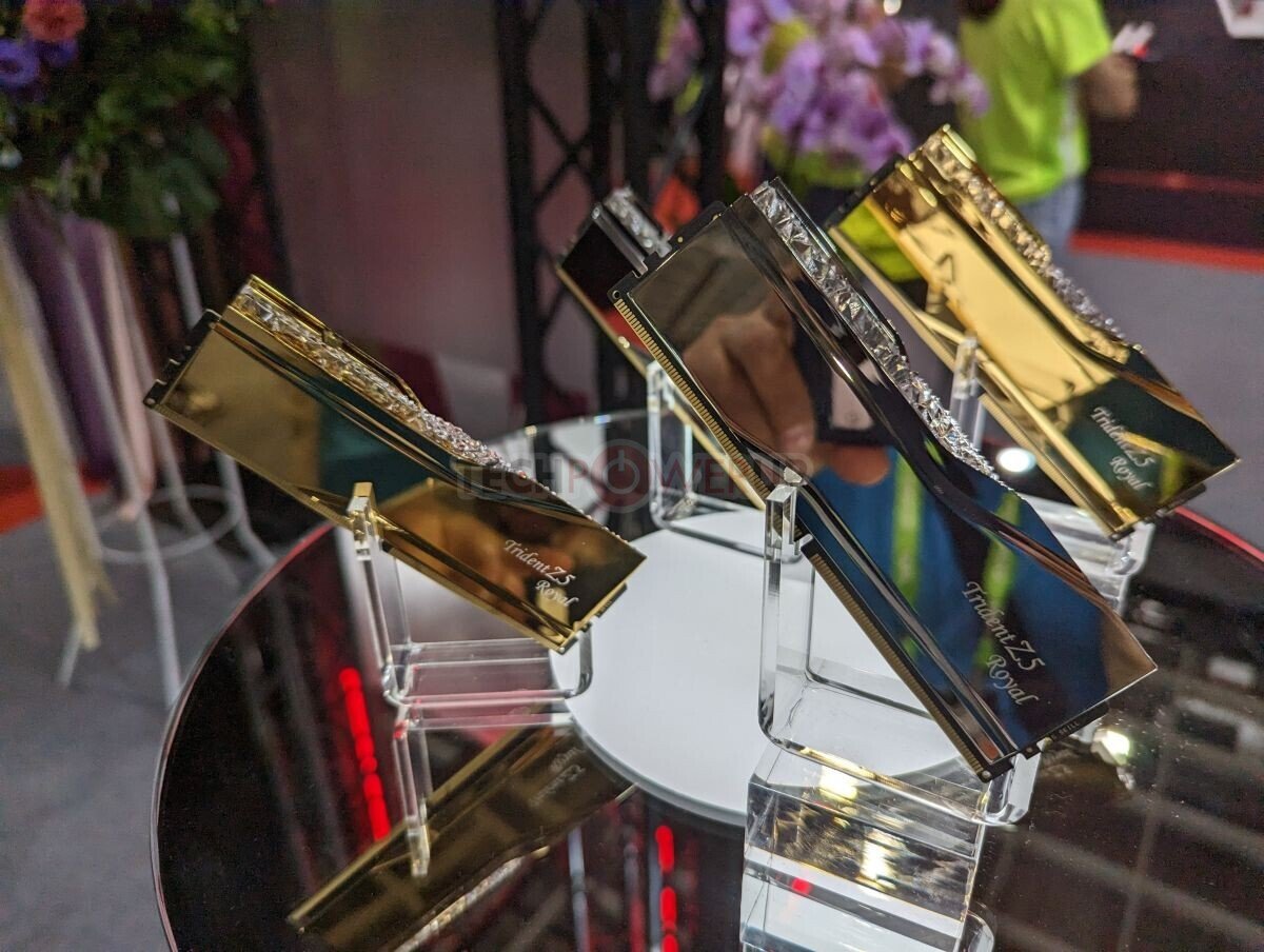 芝奇在现场还展示了一些非2次幂递增的新款内存,比如DDR5-6800 96GB(48GB x2)套装,时序为CL34-46-46-108。同时芝奇首次展出了Trident Z5 Royal系列内存,配置的散热模块具有光彩夺目的美学设计,外观为金色,顶部配有碎钻RGB灯,而Trident Z5 RGB系列内存也会有金色和银色的版本。