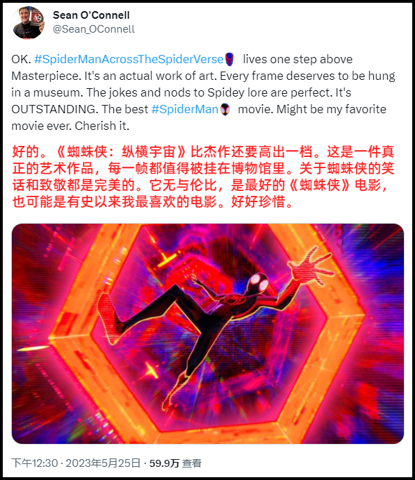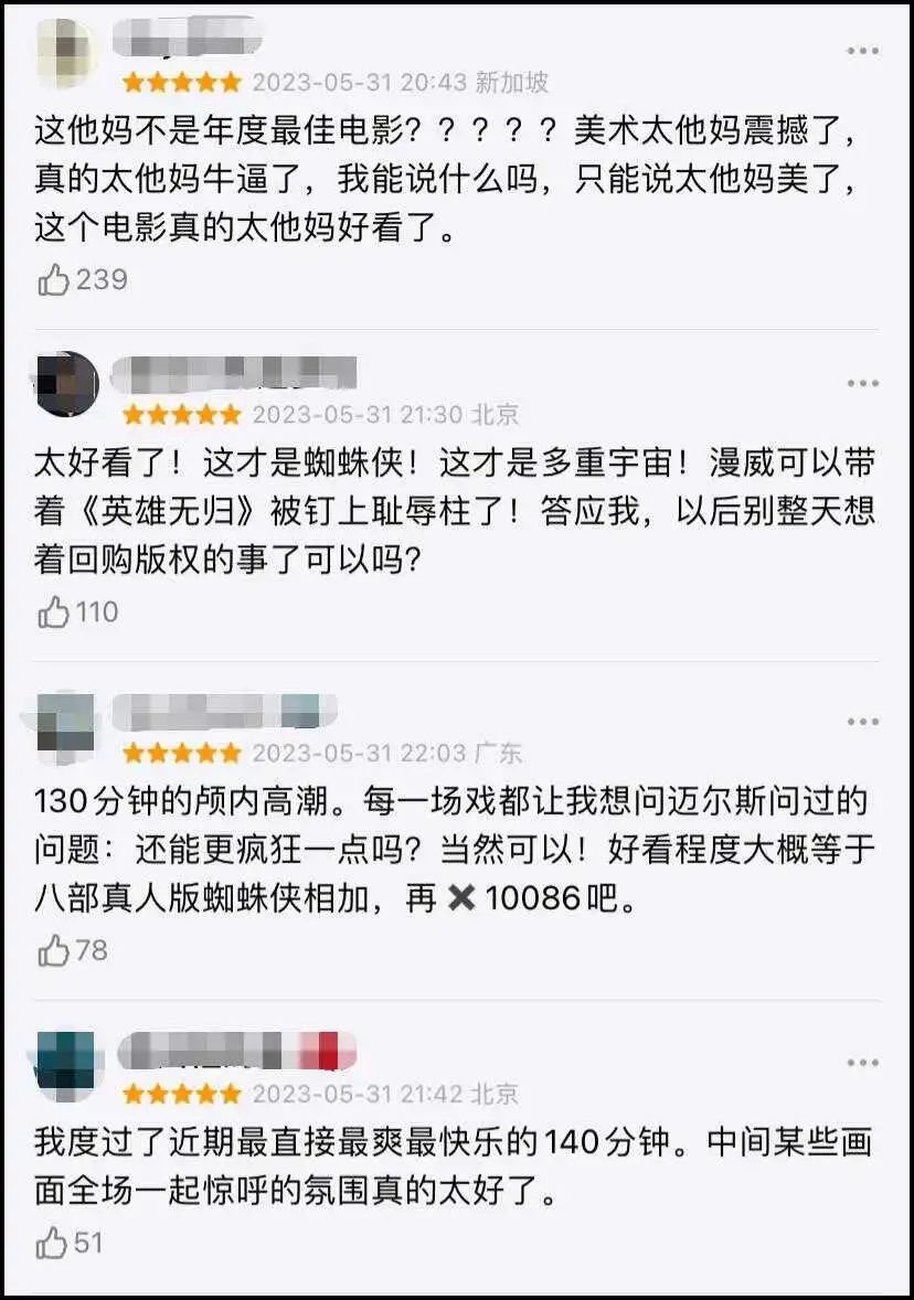 “真正的艺术品,每一帧都值得挂在博物馆,有史以来最好的蜘蛛侠电影。”