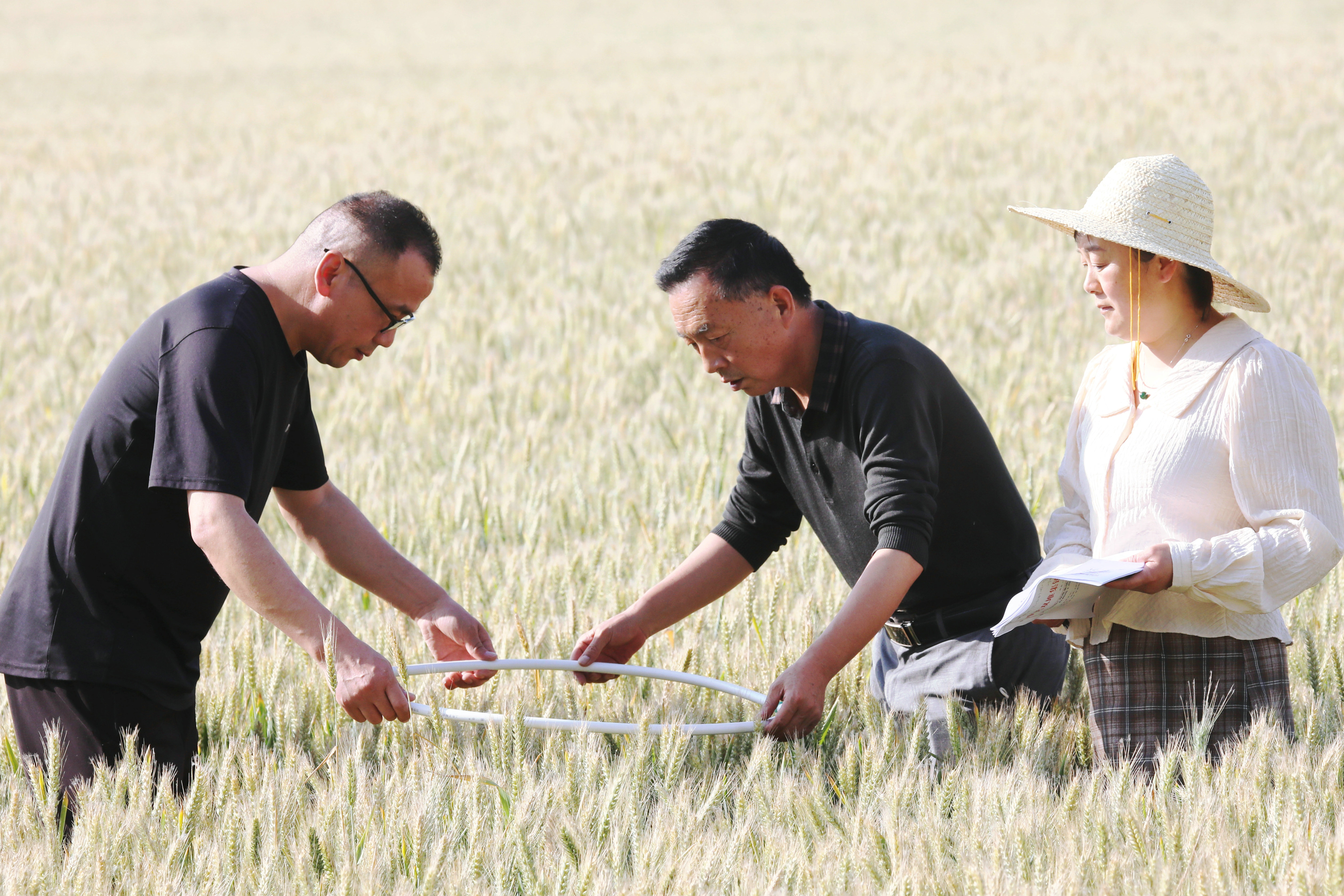 5月24日,濉溪县双堆集镇农业农村局科技特派员在该镇邹圩村为小麦测产,预测亩产平均在612公斤以上,夏粮丰收在望。