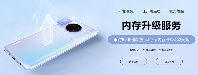 手机使用久了,由于拍摄的照片、视频以及应用程序的增多,容易产生存储空间不足的情况。近日,华为上线了8.8存储内存升级服务,通过更换更大的存储芯片,可以解决手机存储空间不足的问题,指定机型存储内存升级342元起,活动时间6月1日-8月31日。