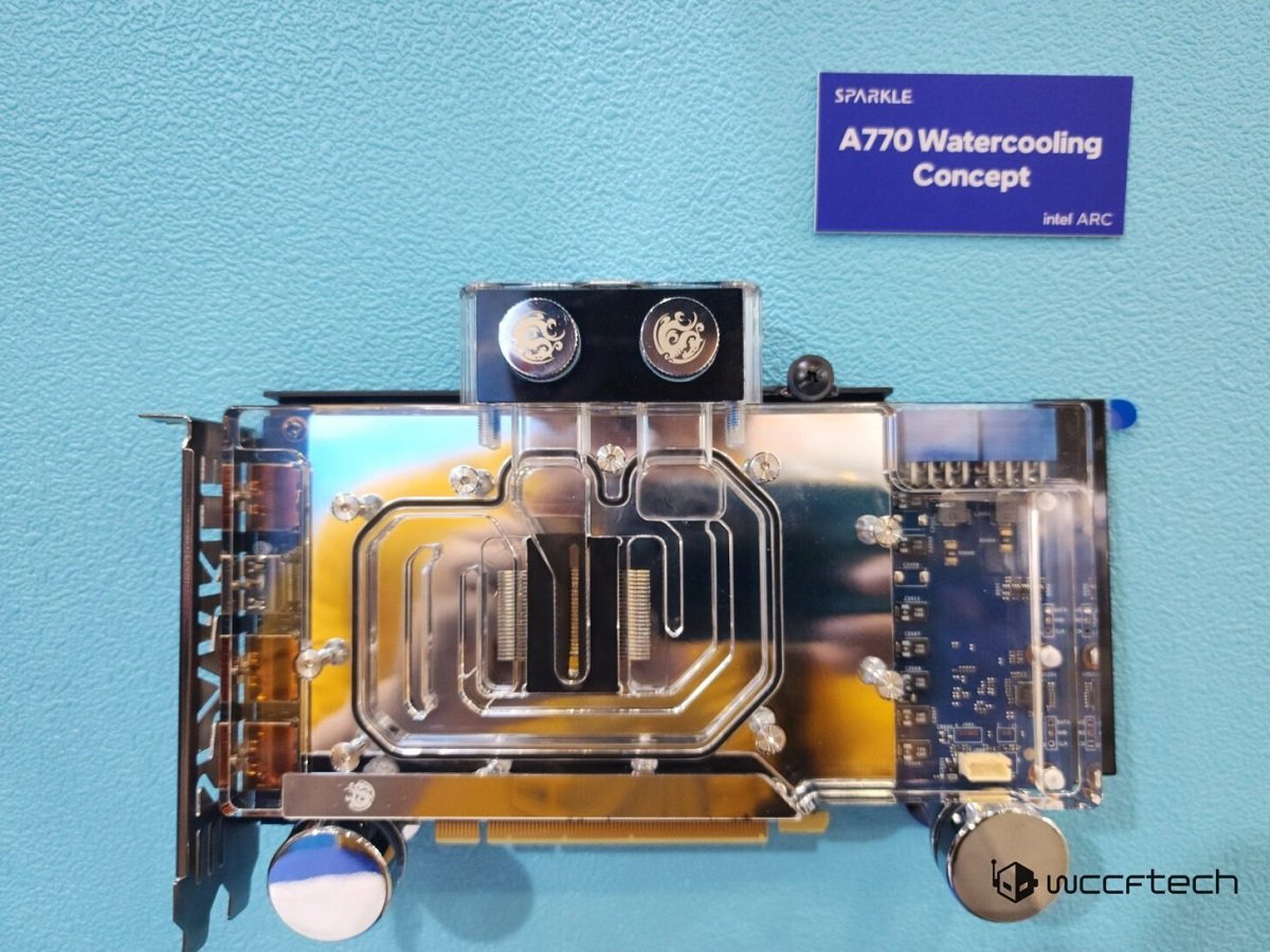旌宇也不仅仅局限于低端或者入门级别的产品上,这次展示的最高端解决方案就是锐炫A770水冷散热设计。其特点是采用定制的PCB设计和Bitspower水冷头,显卡配备了双8Pin外接供电接口。按照锐炫A770的性能级别,没有必要这么做,相信很少玩家愿意为这种设计埋单,更多是一种技术的展示。