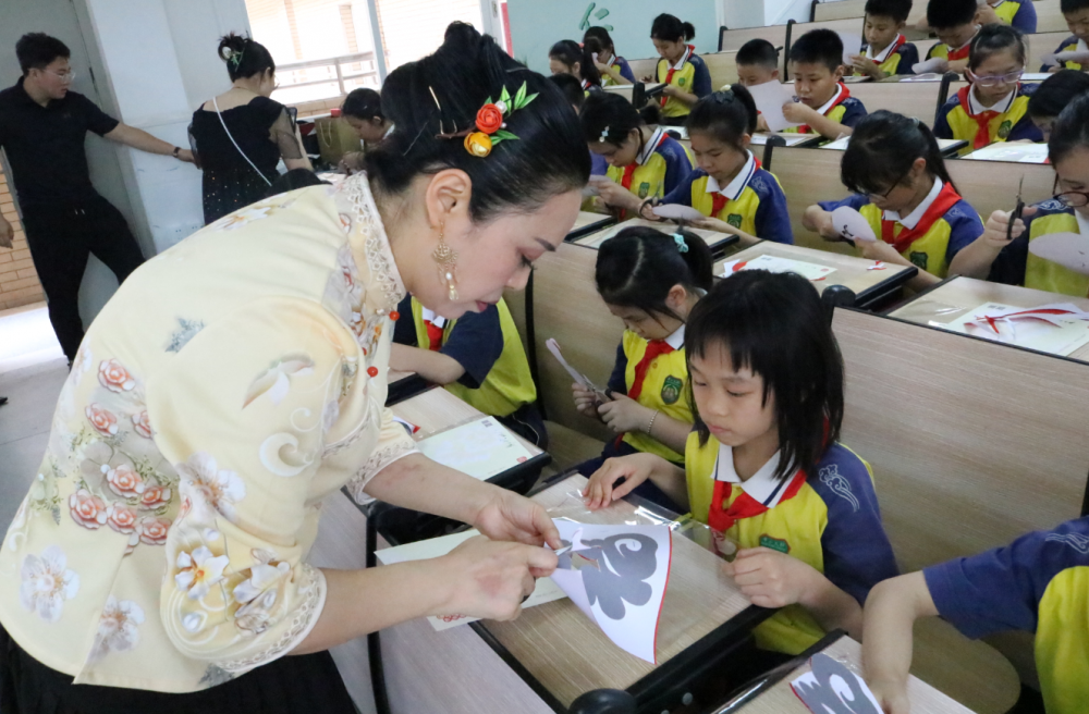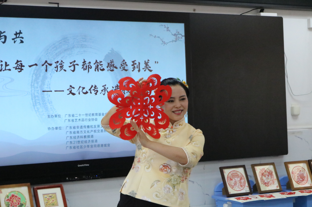 学非遗,玩剪纸,听故事……为传承非遗文化、丰富学生校园生活,6月2日,由广东省二十一世纪教育基金会、广东省艺术品行业协会主办,广东省非遗传播和发展工作站、广东省南方文化产权交易所、21世纪经济报道、广东经济科教频道、广东省社区少年宫同德港城宫协办的“让每一个孩子都能感受到美”文化传承进校园活动第一站在广州市越秀区朝天小学开展。