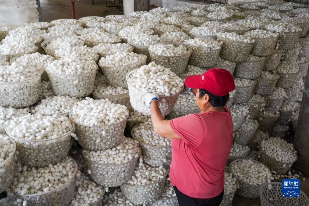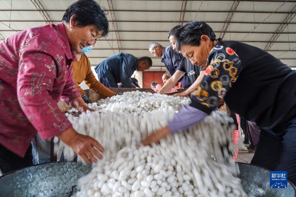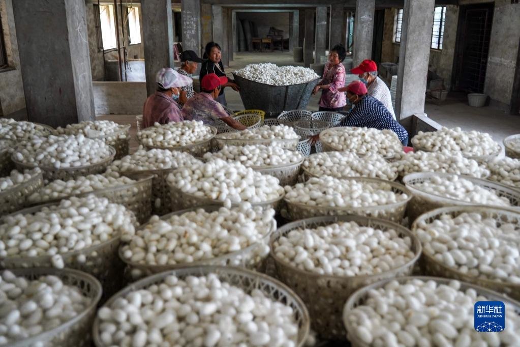 6月2日,工作人员在祝阳镇蚕茧站内分类整理收购来的蚕茧。