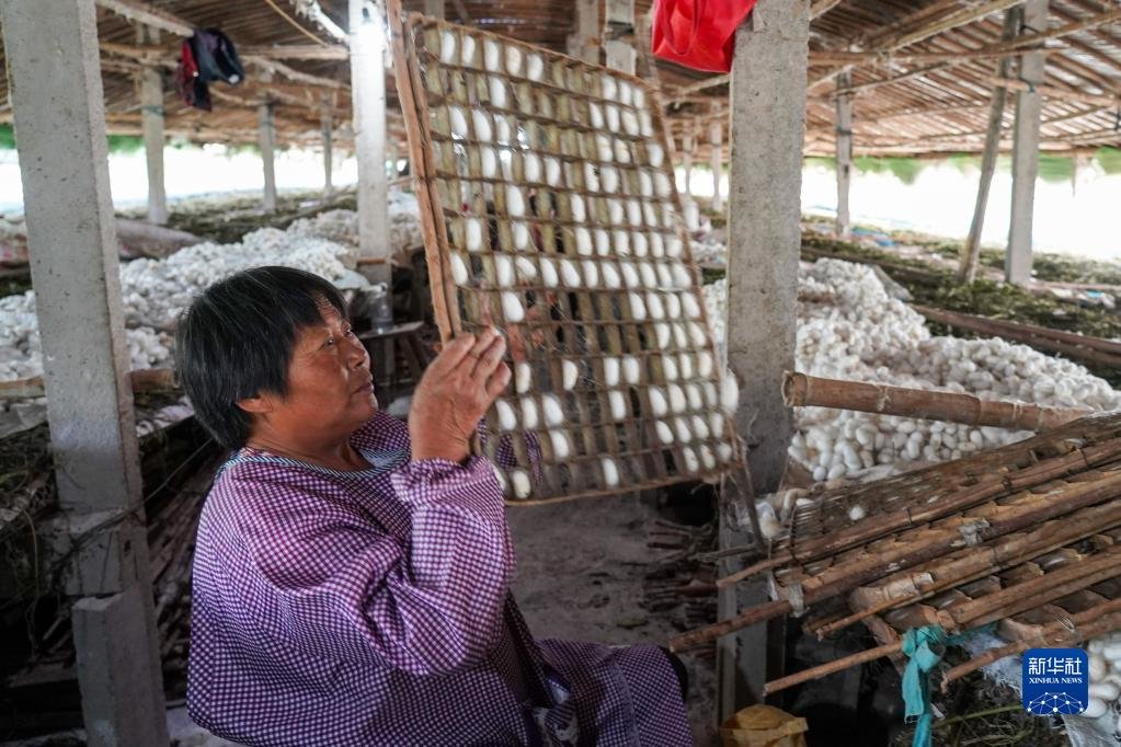 6月2日,岱岳区二王安村蚕农在蚕棚里摘茧。