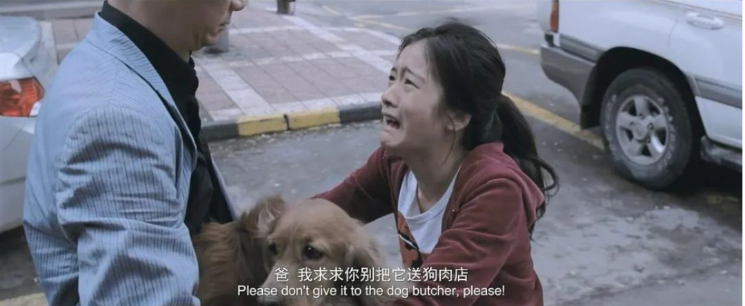 最后热爱狗狗的李玩在餐桌上出乎意料地礼貌吃下亲戚夹来的狗肉,是被驯服收起棱角后对成人世界的无奈妥协。