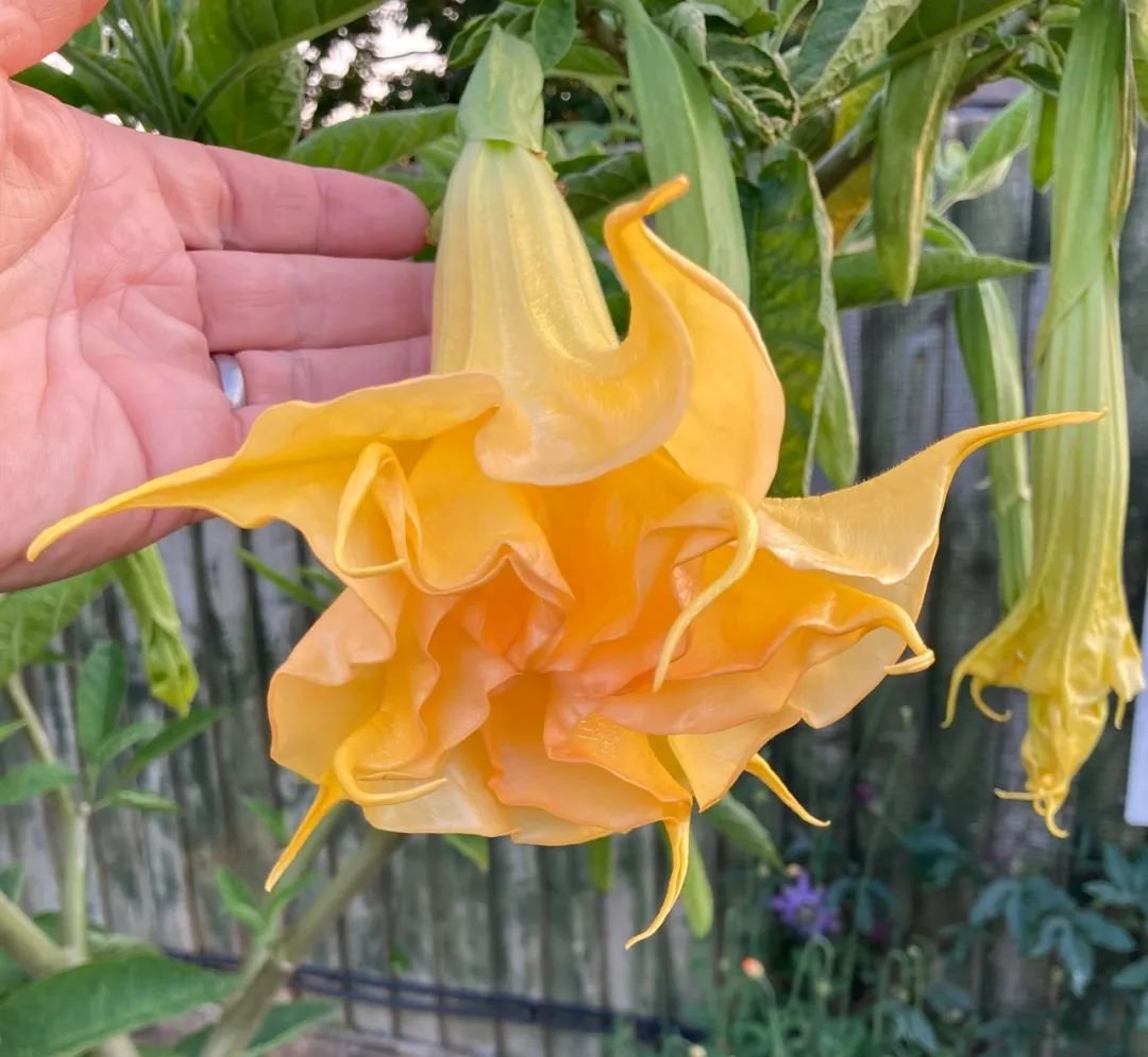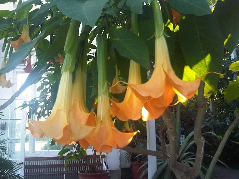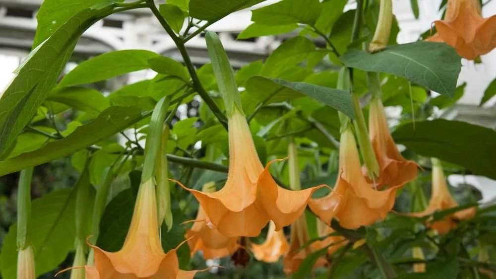 而现在我们能够在花市里买到的一些木本曼陀罗,都是园艺杂交的品种,比如常见的金喇叭木本曼陀罗(Brugmansia 'grand marnier')。