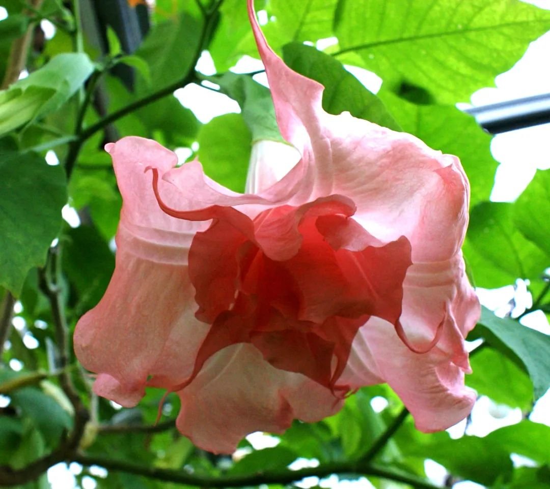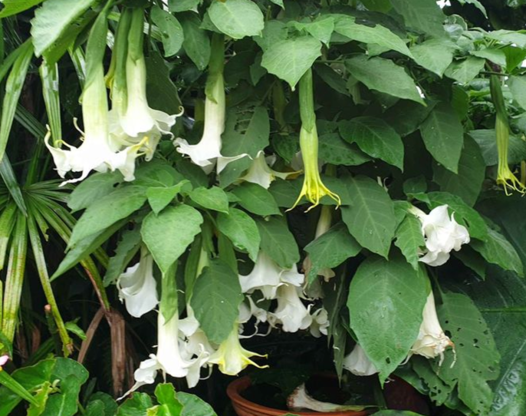 木本曼陀罗的观赏性还是很好的,它的花量特别多,在常年温暖湿润的环境下,再加上充足的光照,它能够开出满树的花朵,它的花每一朵都像喇叭,花朵都是低垂下来的,在国外人们会叫它天使的喇叭,或者叫天使的号角(天使的小号)。