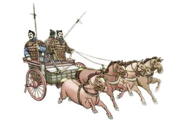 《尚书 · 甘誓》据说是在夏代刚刚建立的时候,夏启讨伐有扈氏时, 在甘这个地方决战,启在战前誓师所发表的训词。这篇文章不太可能是夏代初年写的,因为当时根本就没有文字,应该是后人根据传闻而写成的,有人猜测是商代人写的,也有人认为是战国时人写的。我们来看看其中对军队的命令:“左不攻于左,汝不恭命;右不攻于右,汝不恭命;御非其马之正,汝不恭命。”如果车左不善于射箭,车右不善于近战,御者不能使马左右进退适当,都是不遵奉我的命令。这里可以很明显地看出,这说的已经是典型的三人制兵车了。而且文中没有提到其他兵种,看来真正的作者所处的时代,是兵车作为军队主力作战的时代。