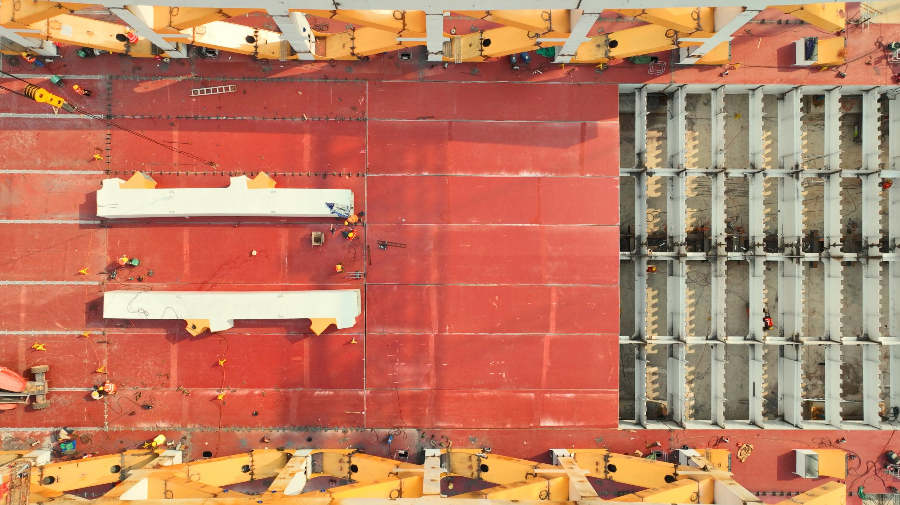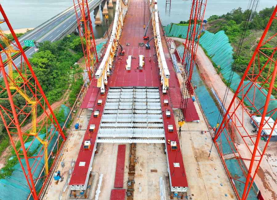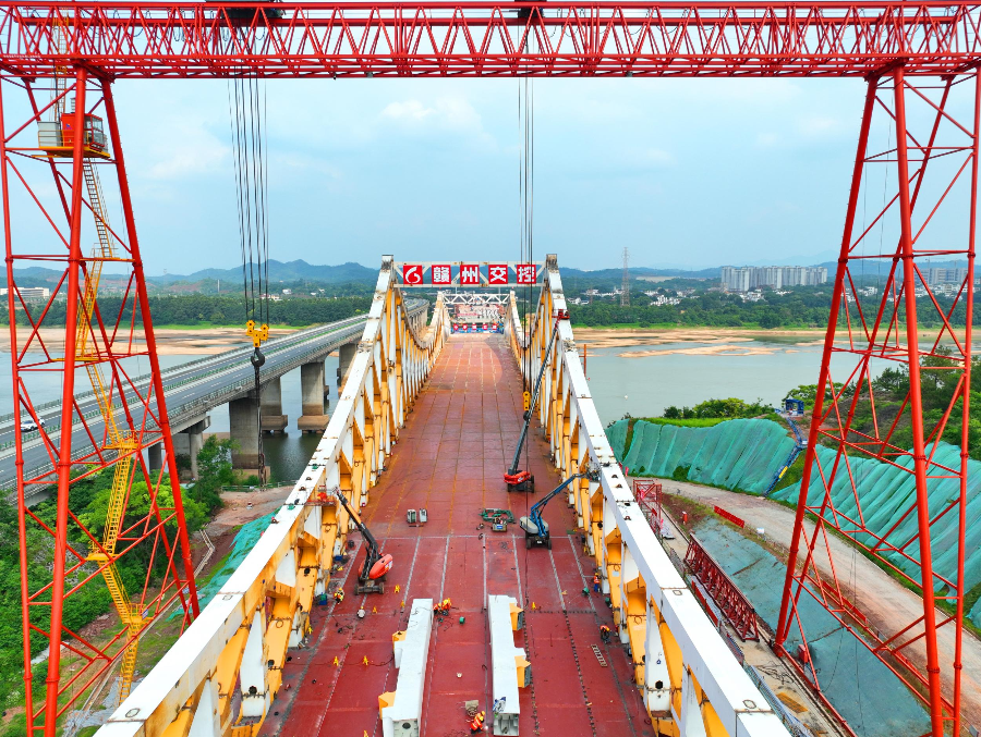 6月2日,赣州市螺溪洲大桥项目建设工地,一座造型如同连绵群山的钢桥正逐步横跨赣江。主桥钢桁架将分五轮顶推施工,其中第三轮顶推总重量9849.9吨,推进长度98.5米。螺溪洲大桥全长1.74千米,采用多跨敞开式桁架结构,是一座跨越赣江的大型钢桁架桥,也是国内首个采用全K型桁架结构的大跨径桥梁。作为赣州市新的地标建筑,大桥建成后,将助力加快“中国稀金谷”核心区与章贡区水西片区互联互通,为章贡区和赣县区居民出行创造快捷便利的交通环境。特约记者朱海鹏 通讯员薛顺鑫 摄