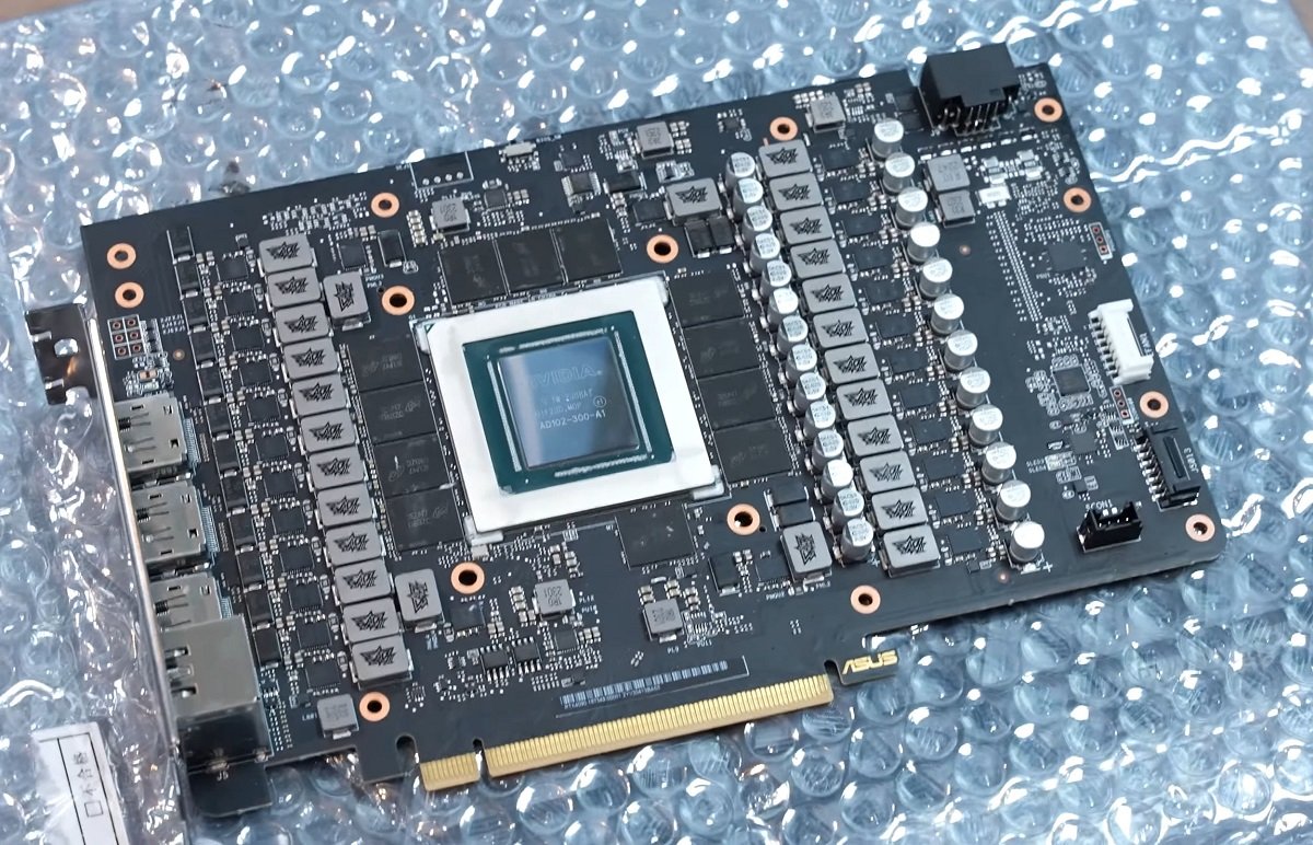 GeForce RTX 4090 ROG Matrix显卡使用了一个无缝的金属框架,厚度为2.5槽,漂亮的外罩带有RGB灯效,板卡部分没有配备任何风扇,尾部有金属支架为导液管连接处提供支撑,整合了液态金属导热组件,所有散热均由一体式水冷解决方案提供。搭配的是ROG MF-12 ARGB系列风扇,采用了磁吸式链接的方式。这次Der8auer有机会拿掉以上的部件,在没有任何覆盖物的情况下拍摄了GeForce RTX 4090 ROG Matrix显卡的PCB板。