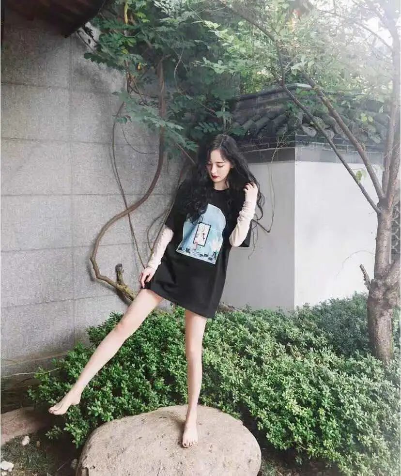 而国内也没闲着,2018年左右,下半身失踪穿搭刷屏各大社交网站。当时正值追求“筷子腿审美”,宽松到能遮住屁股的大T恤可以从视觉上拉长腿的比例。又因为杨幂常穿,被大家统称为“幂式穿搭”。