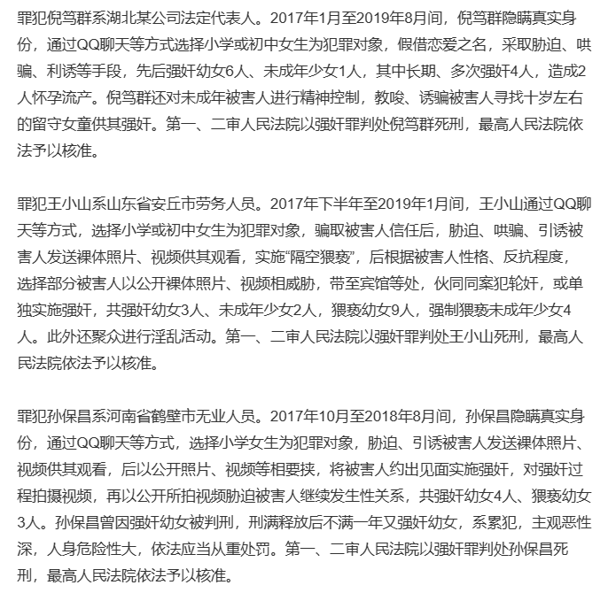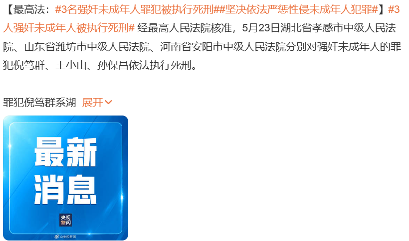 就在5月23日,经最高人民法院核准,湖北省孝感市中级人民法院、山东省潍坊市中级人民法院、河南省安阳市中级人民法院分别对强奸未成年人的罪犯倪笃群、王小山、孙保昌依法执行死刑。