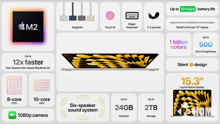 外观方面,15英寸MacBook Air带来了四款颜色,采用15.3英寸Liquid Retina显示屏,支持10亿色和最高500尼特亮度。依旧采用刘海设计,配备1080p前置摄像头、3组阵列麦克风和6扬声器组成的音频系统。该笔记本采用无风扇的静音设计,并且做到了更薄的设计,苹果称其为世界上最薄的15英寸笔记本,重量也仅有3.3磅(约1.54kg)。该笔记本还支持Magsafe充电,续航最高可达18小时。
