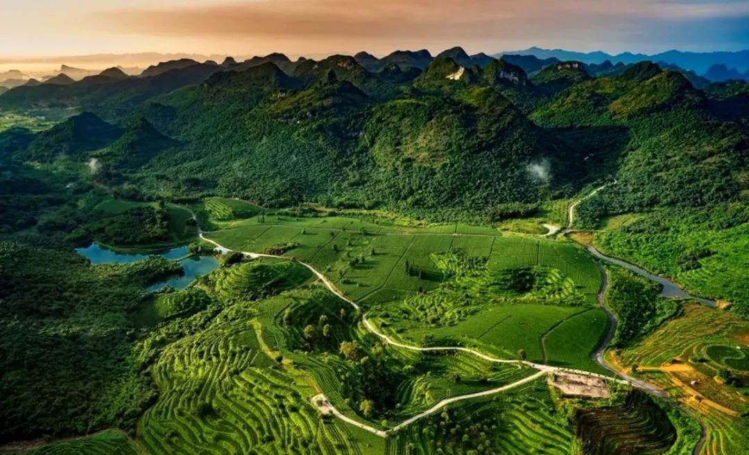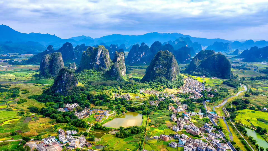 人称广西小桂林的英西峰林,犹如一幅山水田园画卷在眼前徐徐展开。绵延20余里的峰林,一座座姿态各异的石灰岩山峰拔地而起,溪涧、河流流淌其间,景象十分震撼。