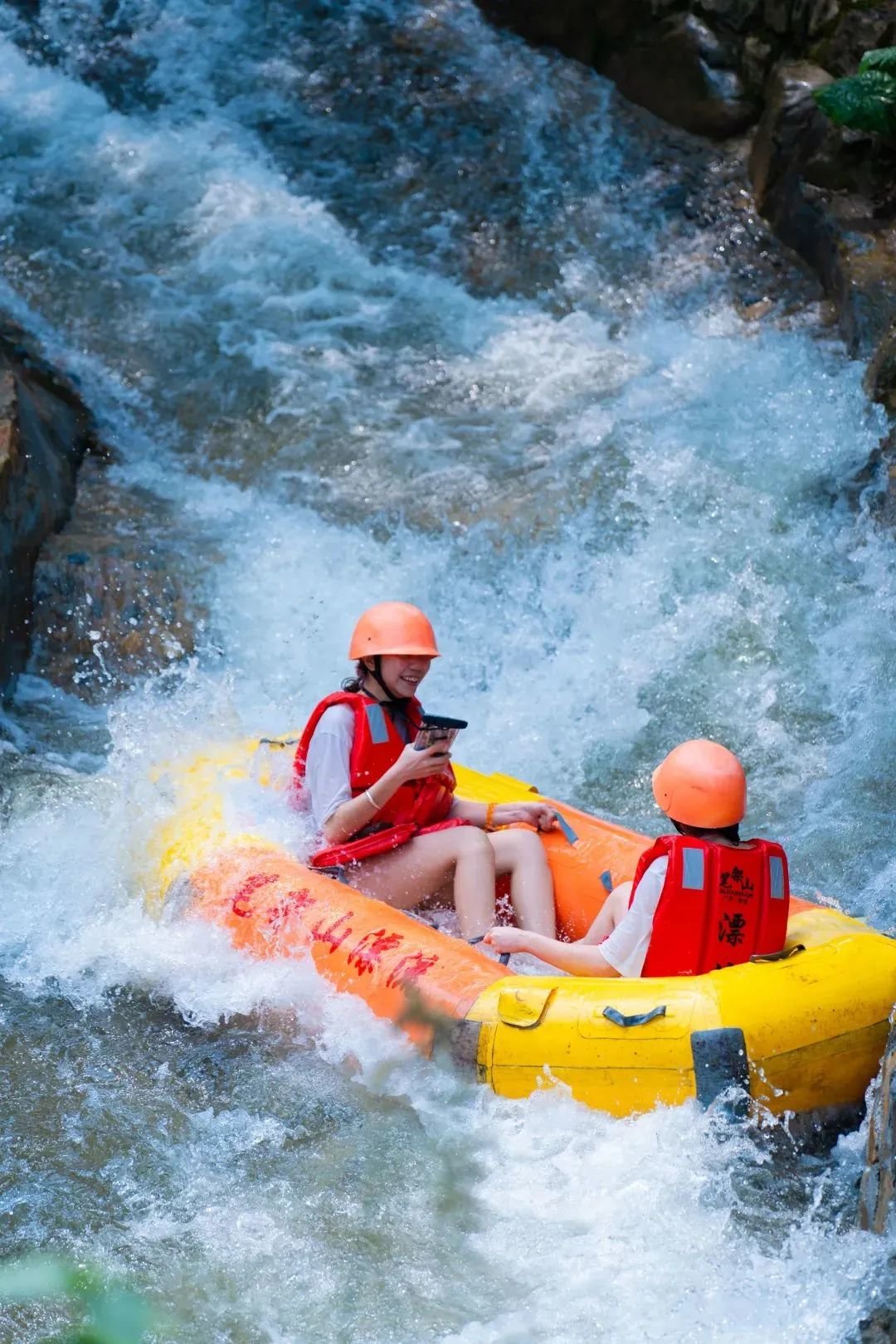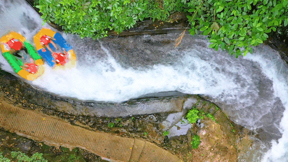 漂流上段险滩密布,皮艇常常腾空跃起,水花扑面袭来,玩得就是心跳;中段则进入了暗河之中,像是参与了一场坐在船上的密逃,起伏高下间,满是惊险;行至下段,水流变得平缓,瞬时有了赏景的心境,不过可要小心随时会卷入别人的水枪大战中,纵情挥舞水盆,释放所有压力。