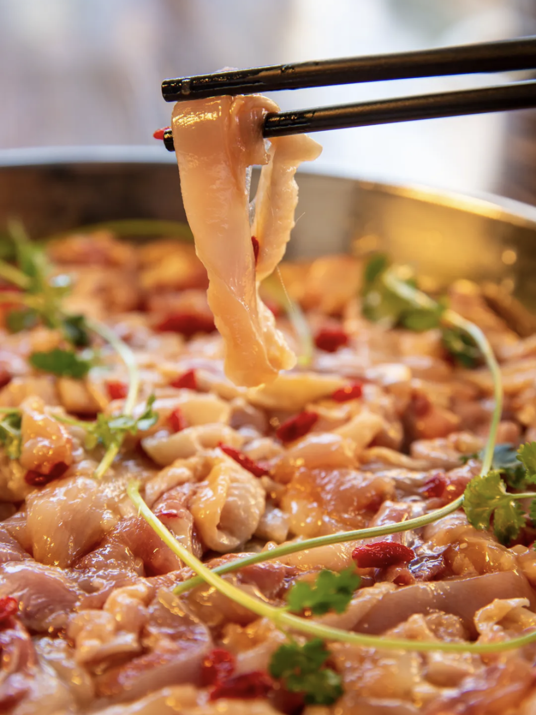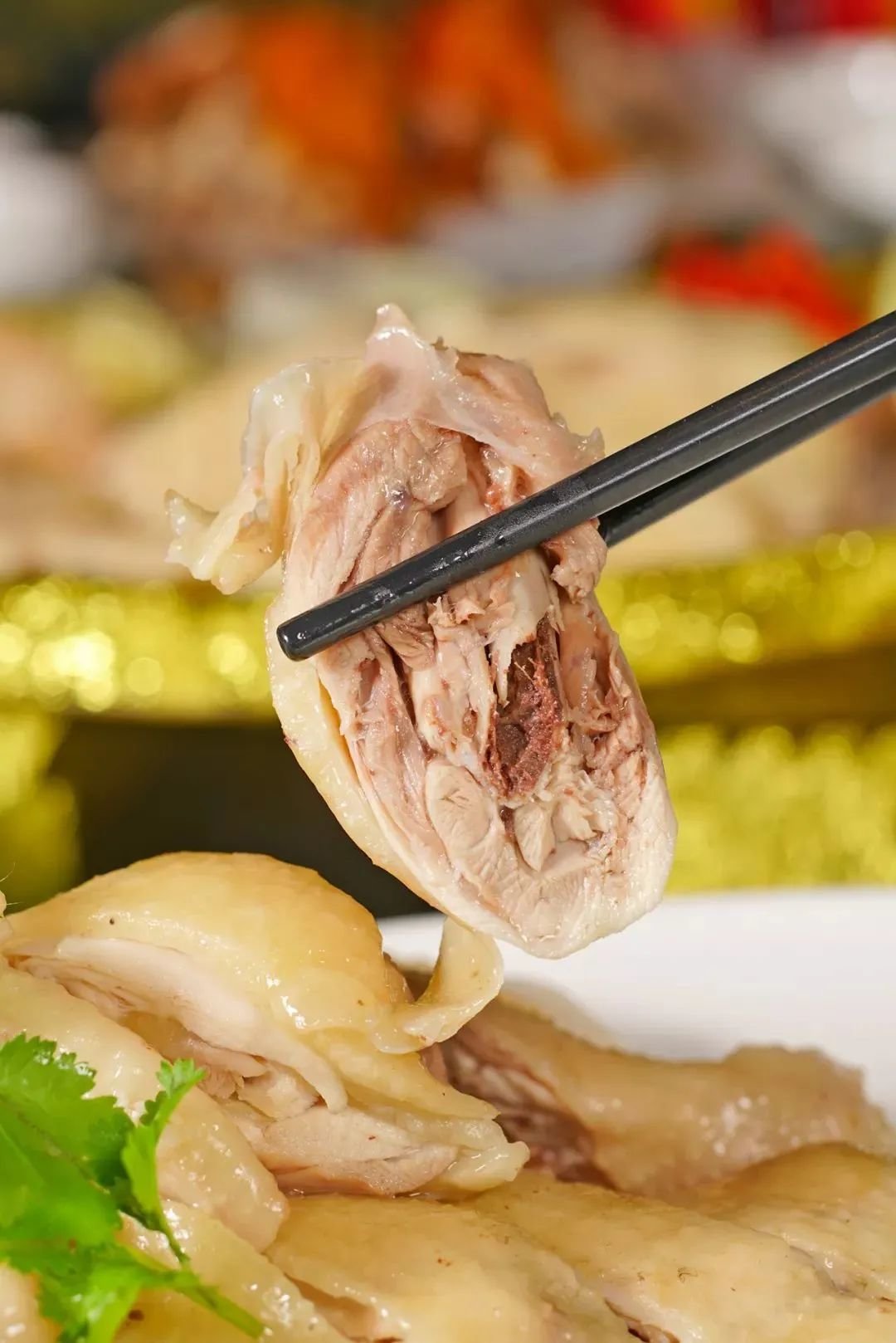 鸡肉上桌,骨红皮亮,光是看着就让人胃口大开。外皮爽滑,自带一丝脆韧感,包裹着多汁的鸡肉,每一口都是超乎意料的细嫩,吃不出任何纤维感。蘸点标配的姜蓉汁,更激发肉香鲜甜。
