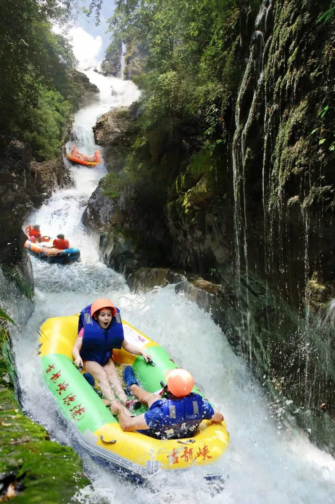 特别的是,古龙峡漂流的河道全程隐蔽在高耸树丛间,一片片绿荫隔绝了夏日毒辣的阳光,即使是高温月,也能在这里享受22℃的玩水快乐。“巅峰古龙峡,刺激惊天下”,如果你也追求漂流的急速快感,那么古龙峡一定不会让你失望。