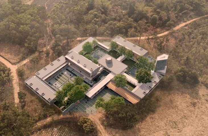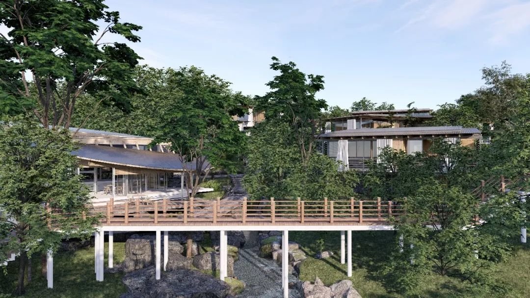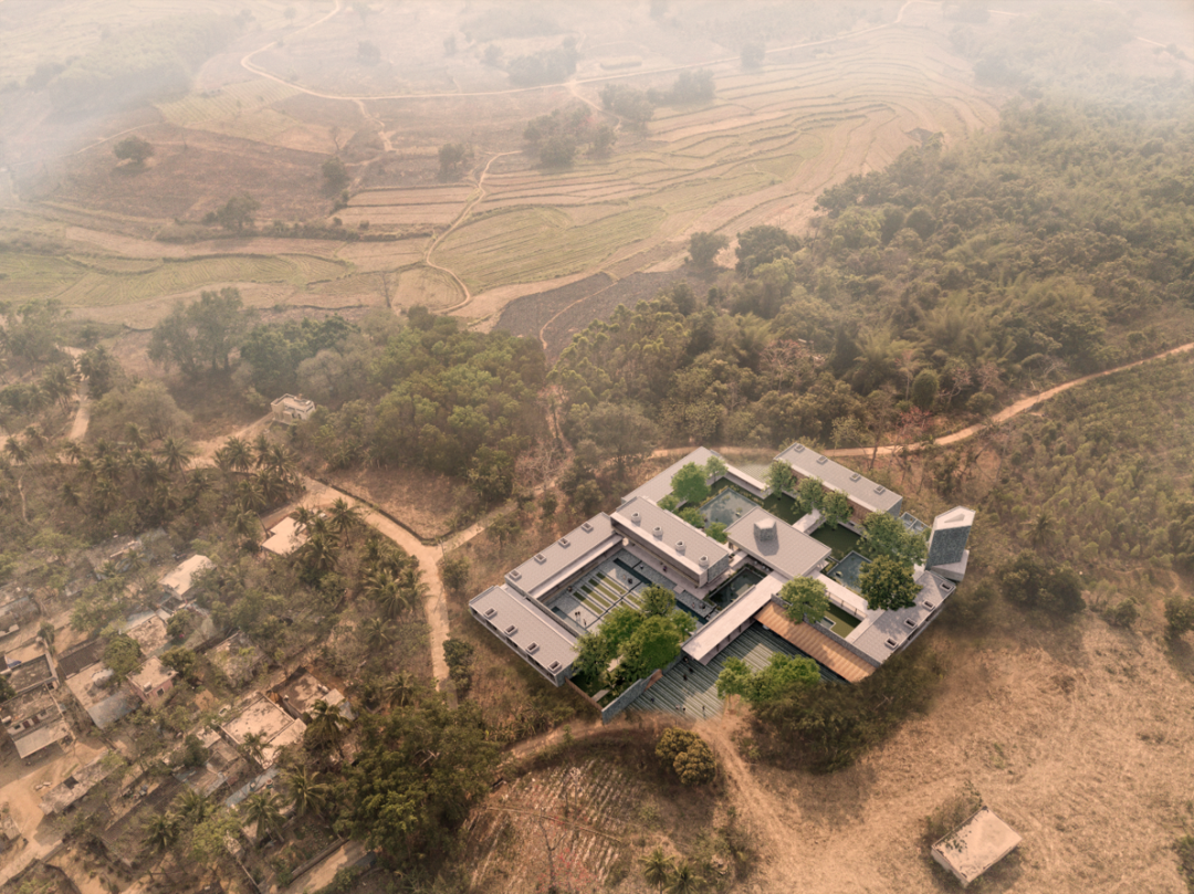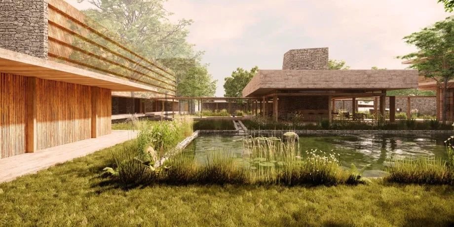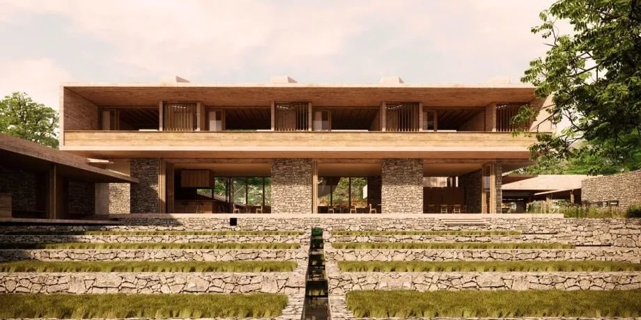 设计上以一系列相互连接的建筑为特色,拥有郁郁葱葱的庭院、重叠的水景,实现与邻近森林农田和景观的对话。