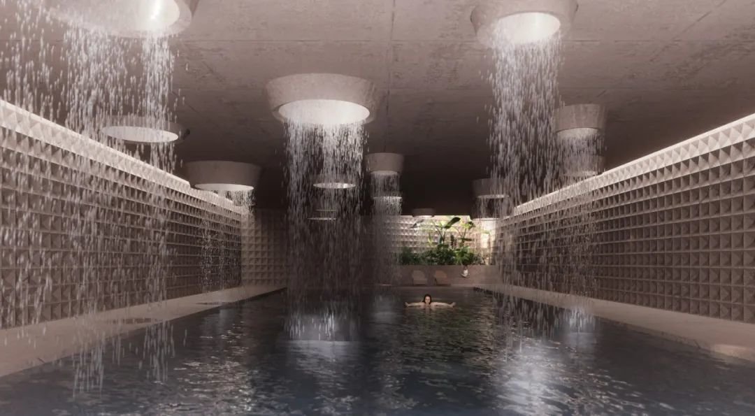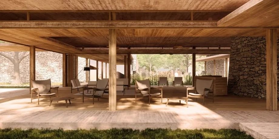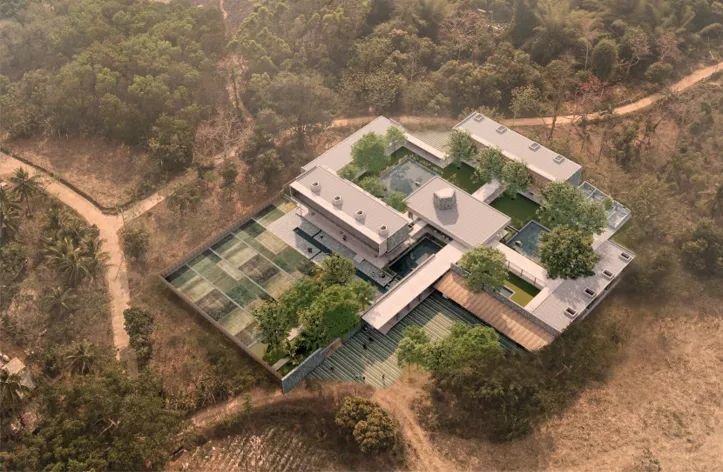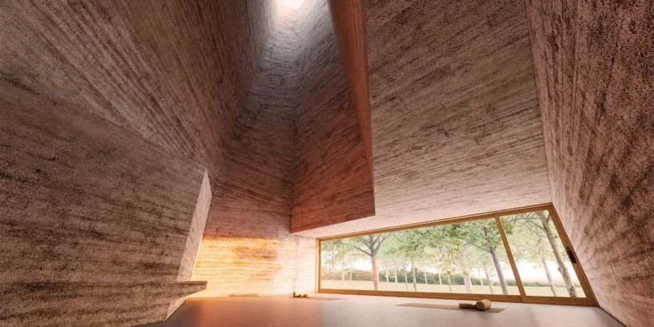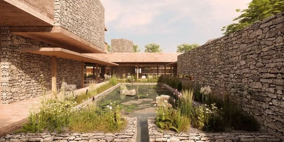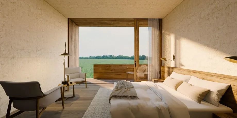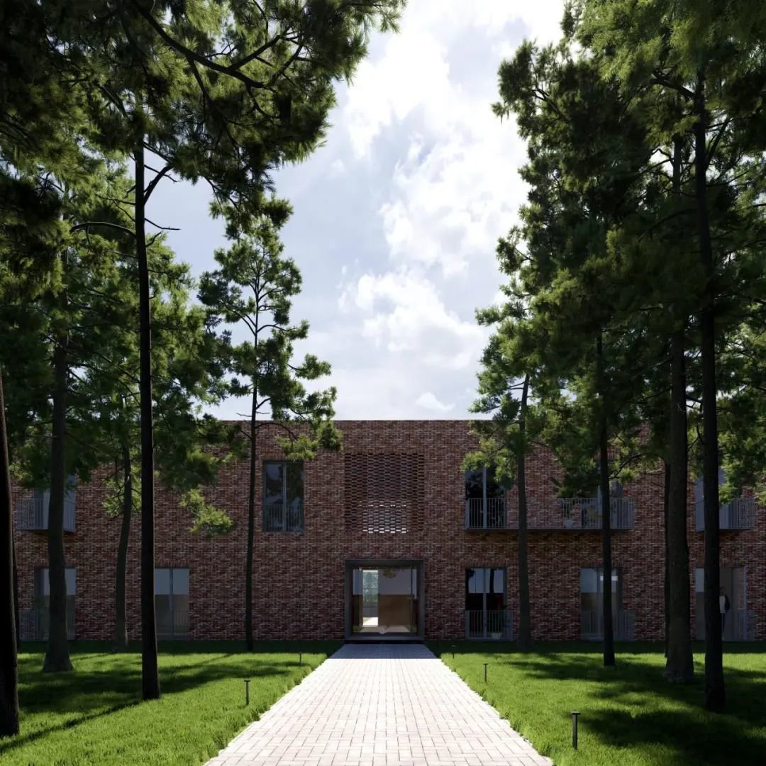 设计上以一系列相互连接的建筑为特色,拥有郁郁葱葱的庭院、重叠的水景,实现与邻近森林农田和景观的对话。