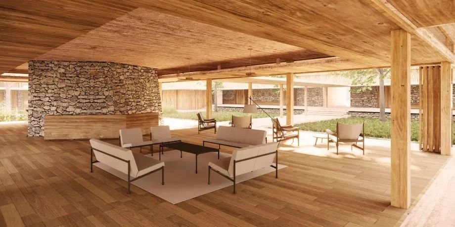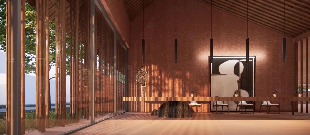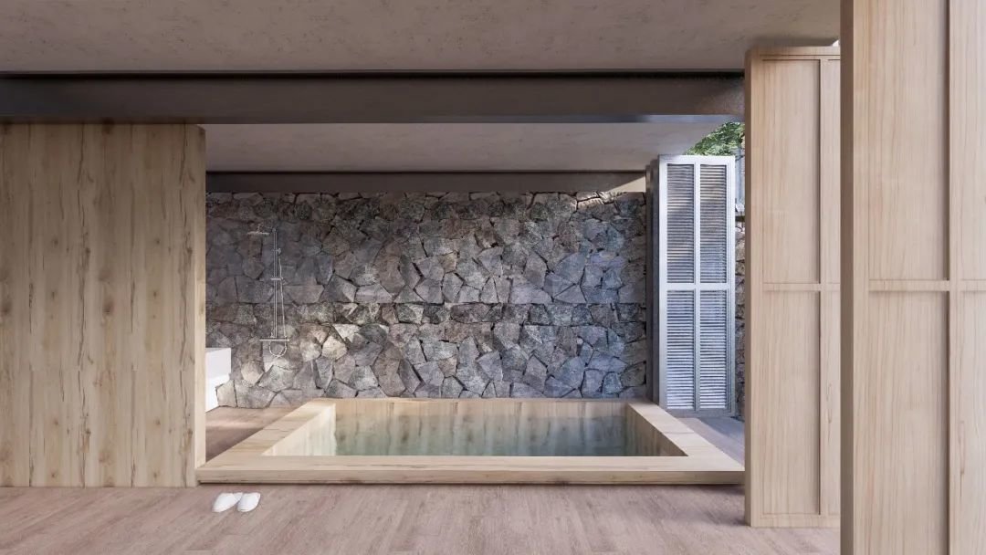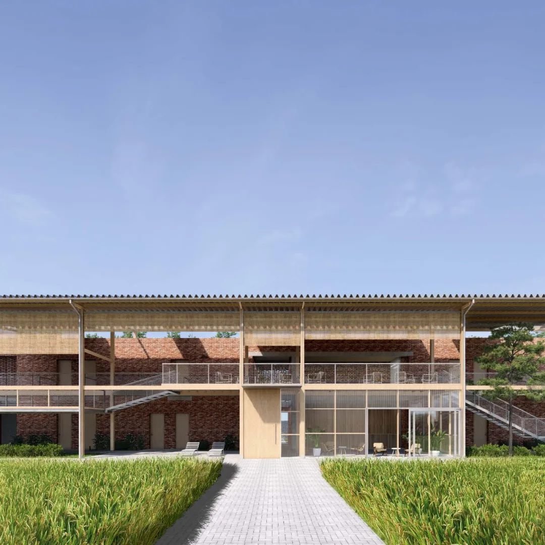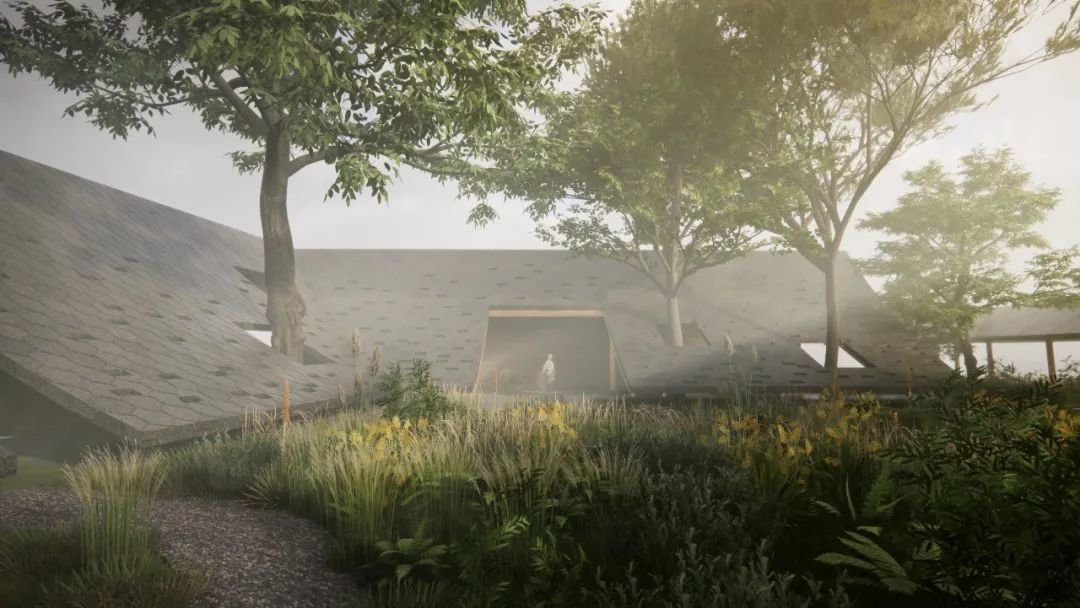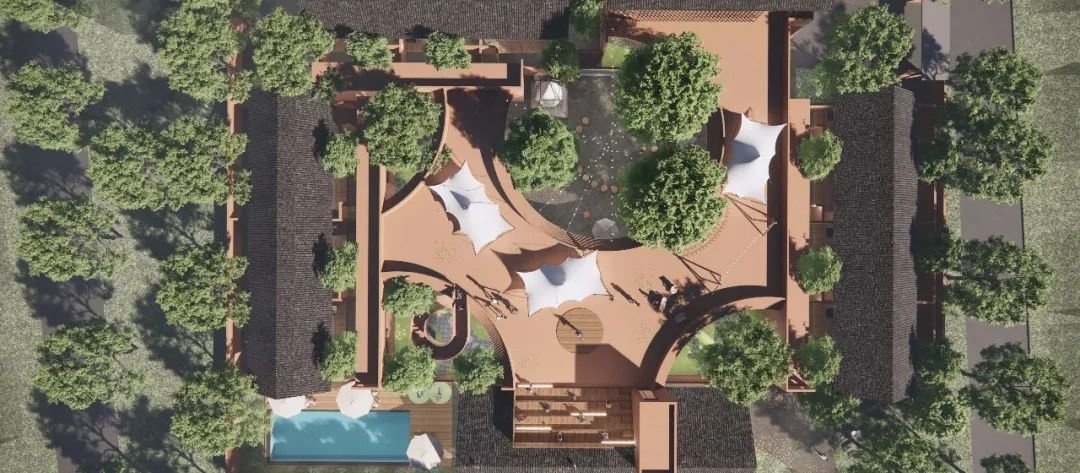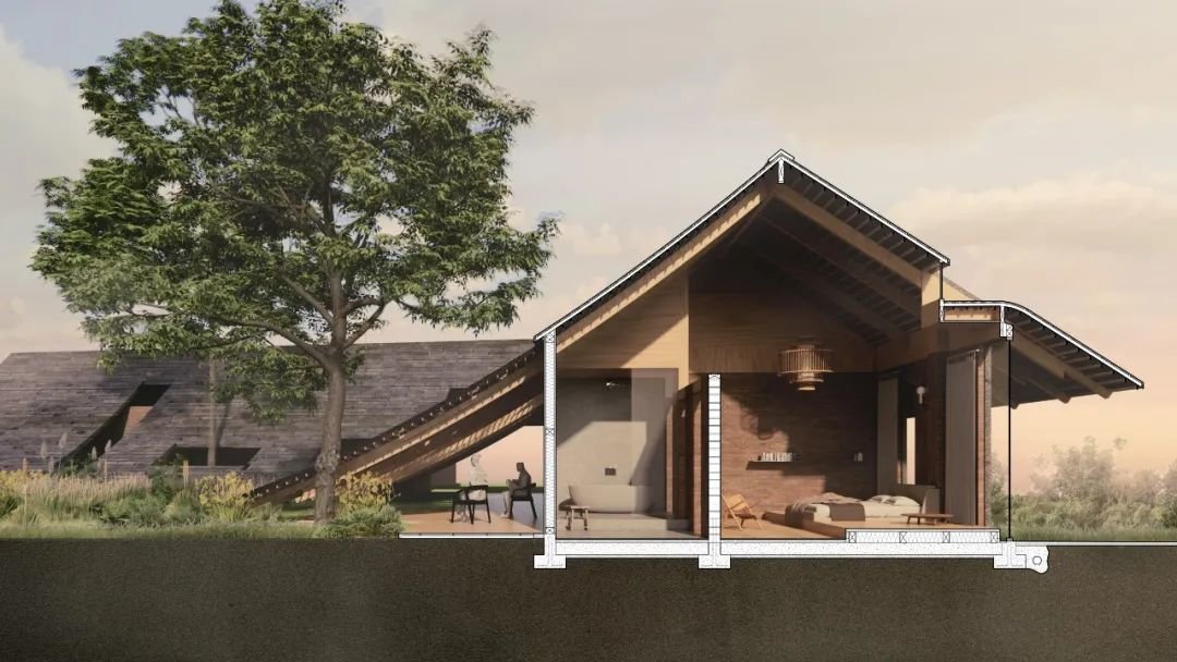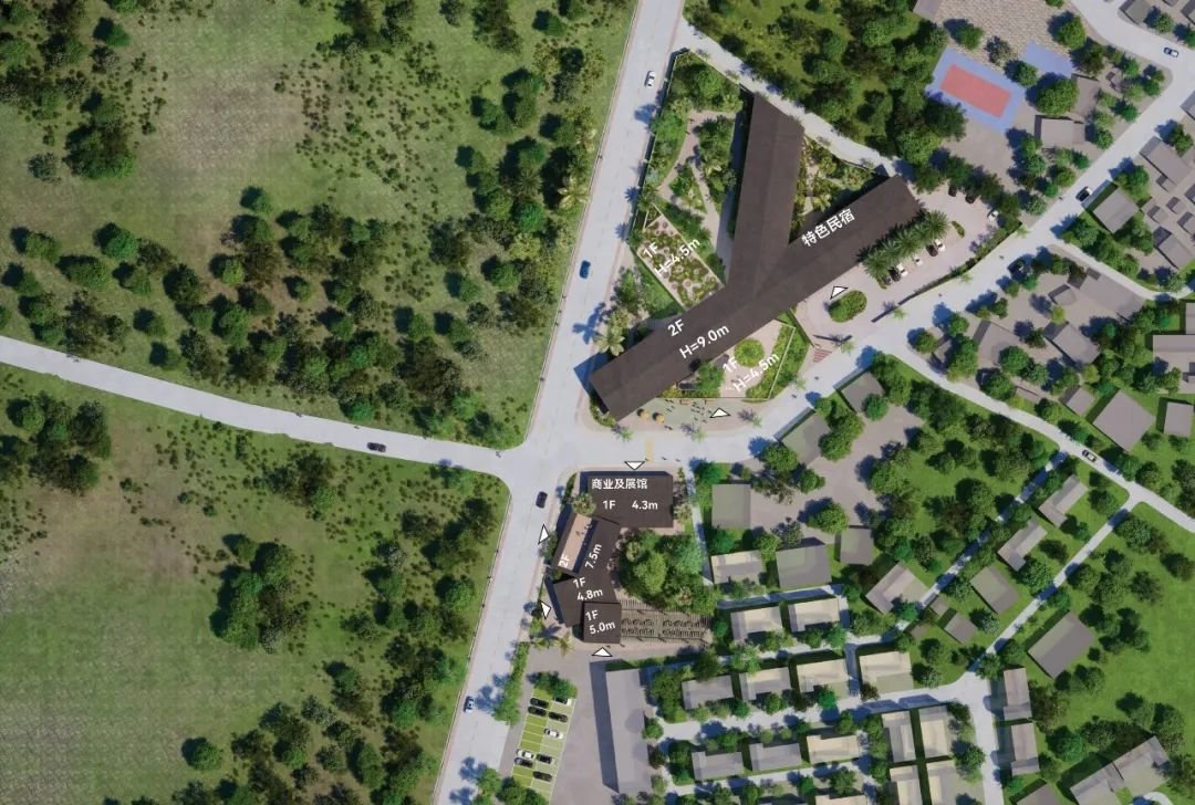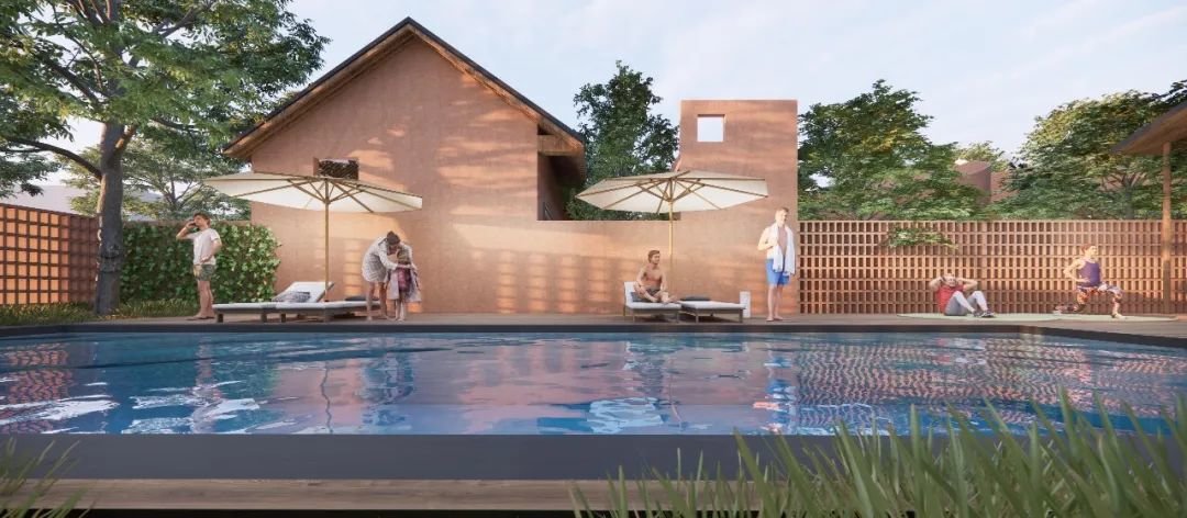 此外,两个地块之间则通过现有外部景观廊道实现连接,东西两侧分别设置两个主要的公共建筑,并调整民宿区的建筑朝向,确保每栋建筑拥有良好的视线,也解决了相邻建筑的隐私问题,在保证民宿区私密性的前提下,为周边居民及游客提供了公共活动的场所。
