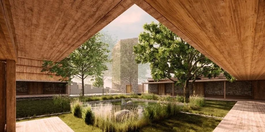 首先出场的是Manifesto Lab.宣言工作室,在尼下村口改造项目的设计中,团队基于对场地既有条件的理解,将项目解读为一个多方汇集交融的中心,把民宿和商业体验两大功能区分别布置在南北两个地块,同时从设计概念上积极响应乡村振兴中五大振兴之二的生态振兴与文化振兴。