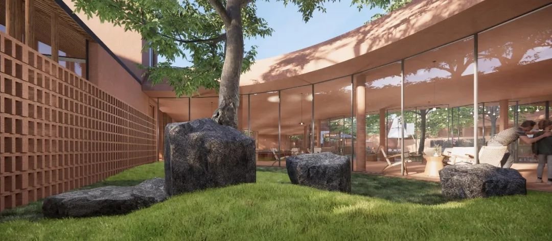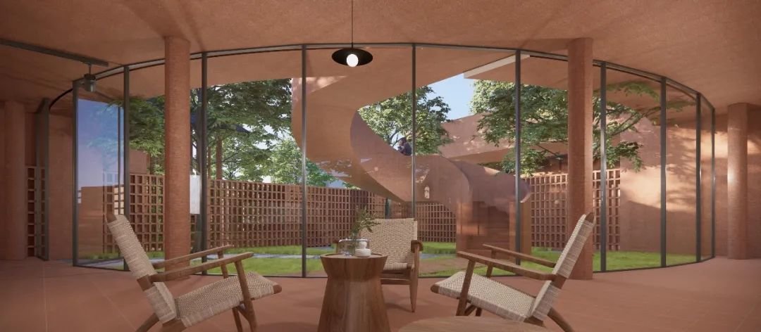 最终,一个内向型的庭院空间成为设计的视觉焦点,借由场地既有树木的位置,自然退让出建筑的室内空间,由此形成了由五个庭院围合的中心共享艺术大厅,同时也通过旋转楼梯的设计,将空间延伸至二层露台,形成一个完全与大自然接触的室外艺术交流发生的场所。