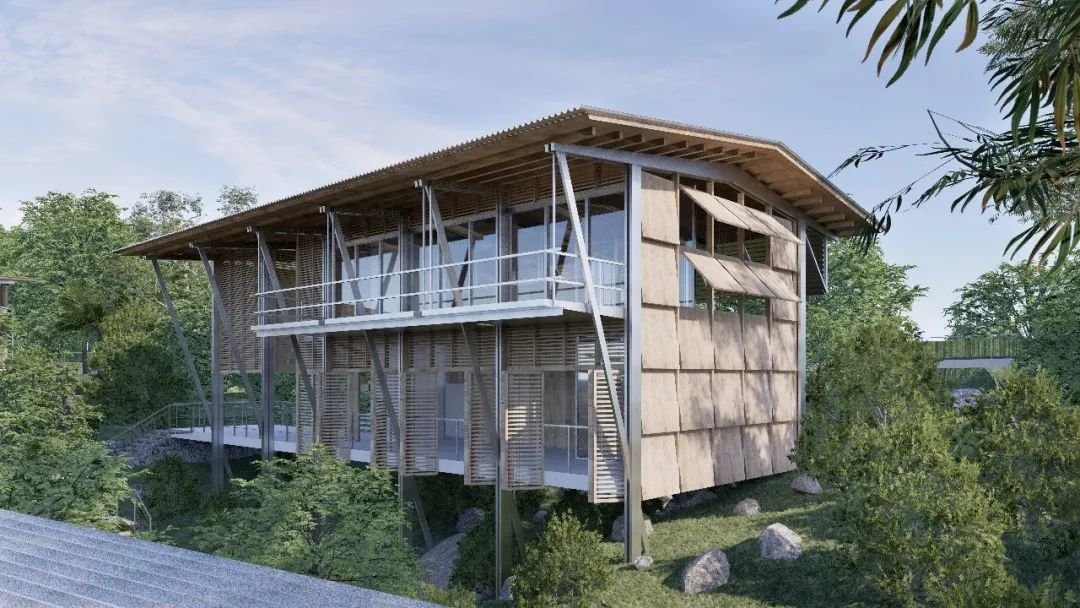 建筑设计从黎族传统谷仓类船型屋的干栏式结构中获取灵感,以轻质框架结构与质朴的自然材料相结合,在斜坡场地上营造了一种朴素中不失现代性的空间氛围。
