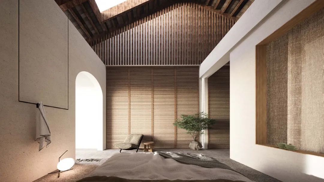 场地内的四个庭院分别名为闻香、听雨、望山、采菊,因为尺度、功能与所处位置的不同,四个庭院呈现出各自独特的空间感,每个都以其独特的感官体验,从不同角度诠释着对自然的理解,也兼具着多功能的可能性来满足民宿与旅客的需求。