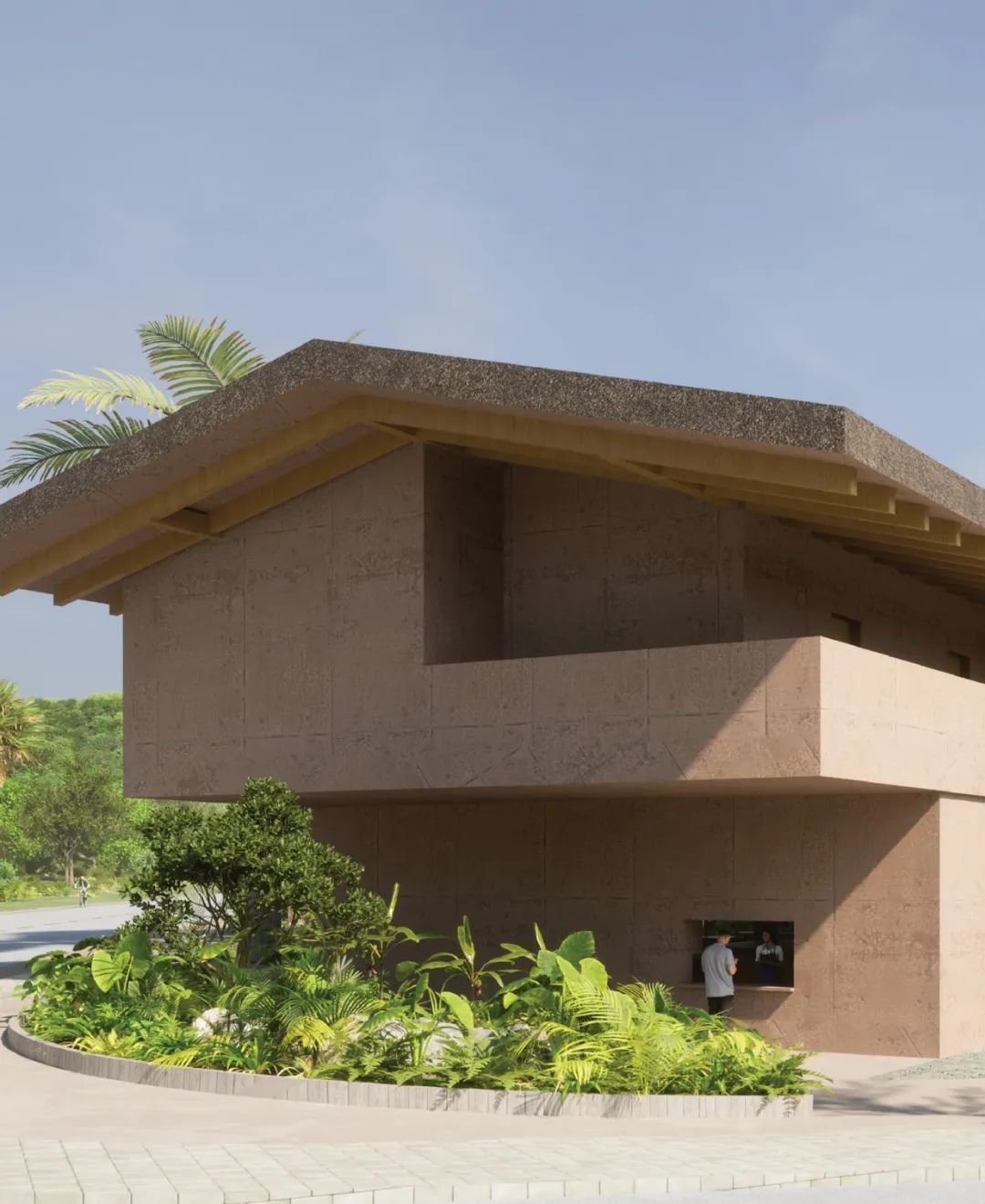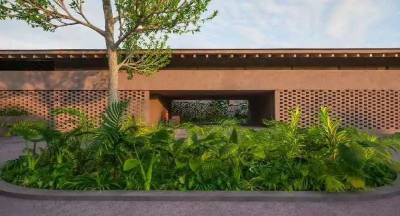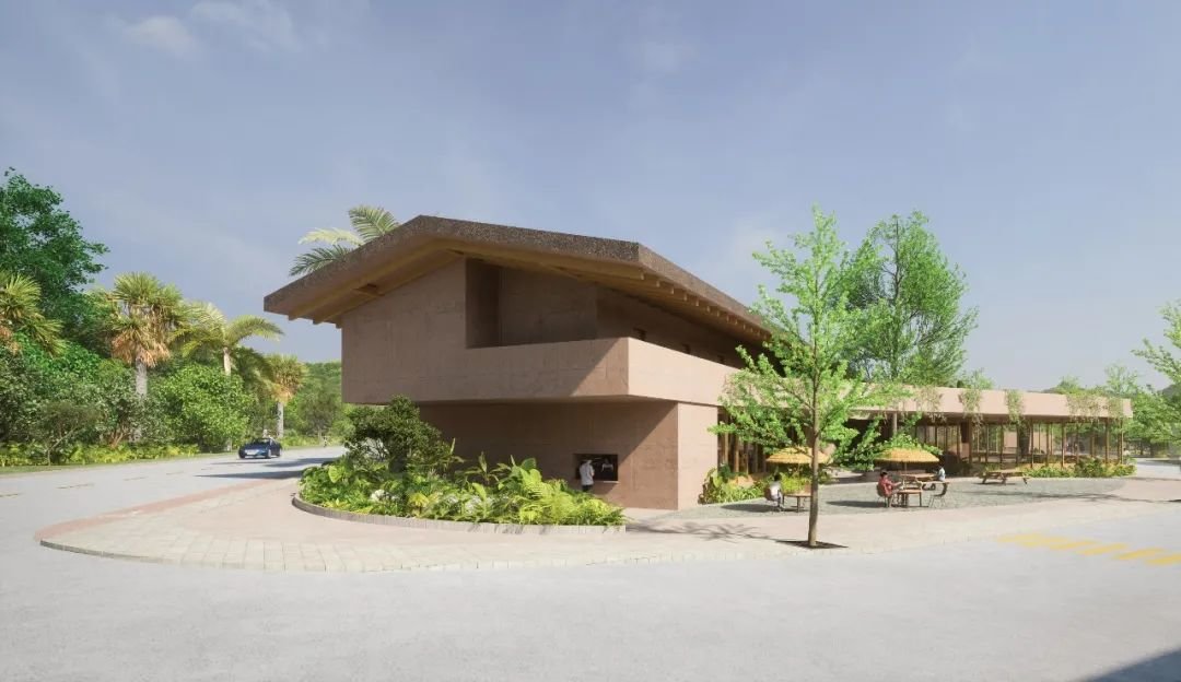 因此,建筑本身需要有某种代表黎乡的艺术家气质,便借由木棉花这一独特的IP形象,设计提炼其鲜明的特征——木棉花的红色,打造一处红色混凝土建筑。