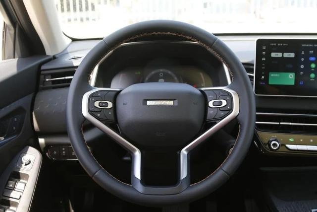 圆形方向盘手感扎实,包裹材质质地也较为柔软。左侧功能区主要控制多媒体、唤醒语音识别控制系统以及车载微信,右侧则主要控制行车电脑和自适应巡航。