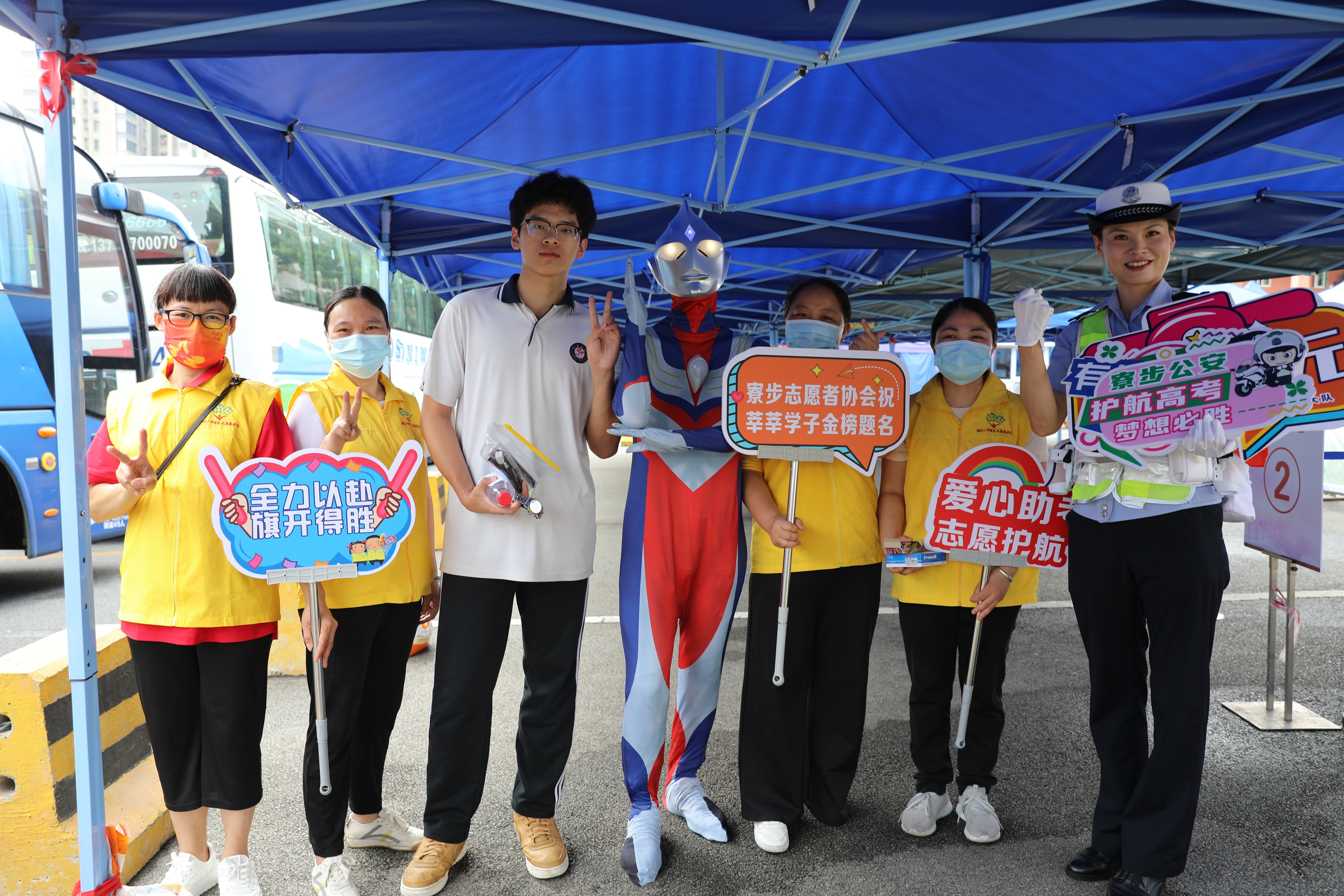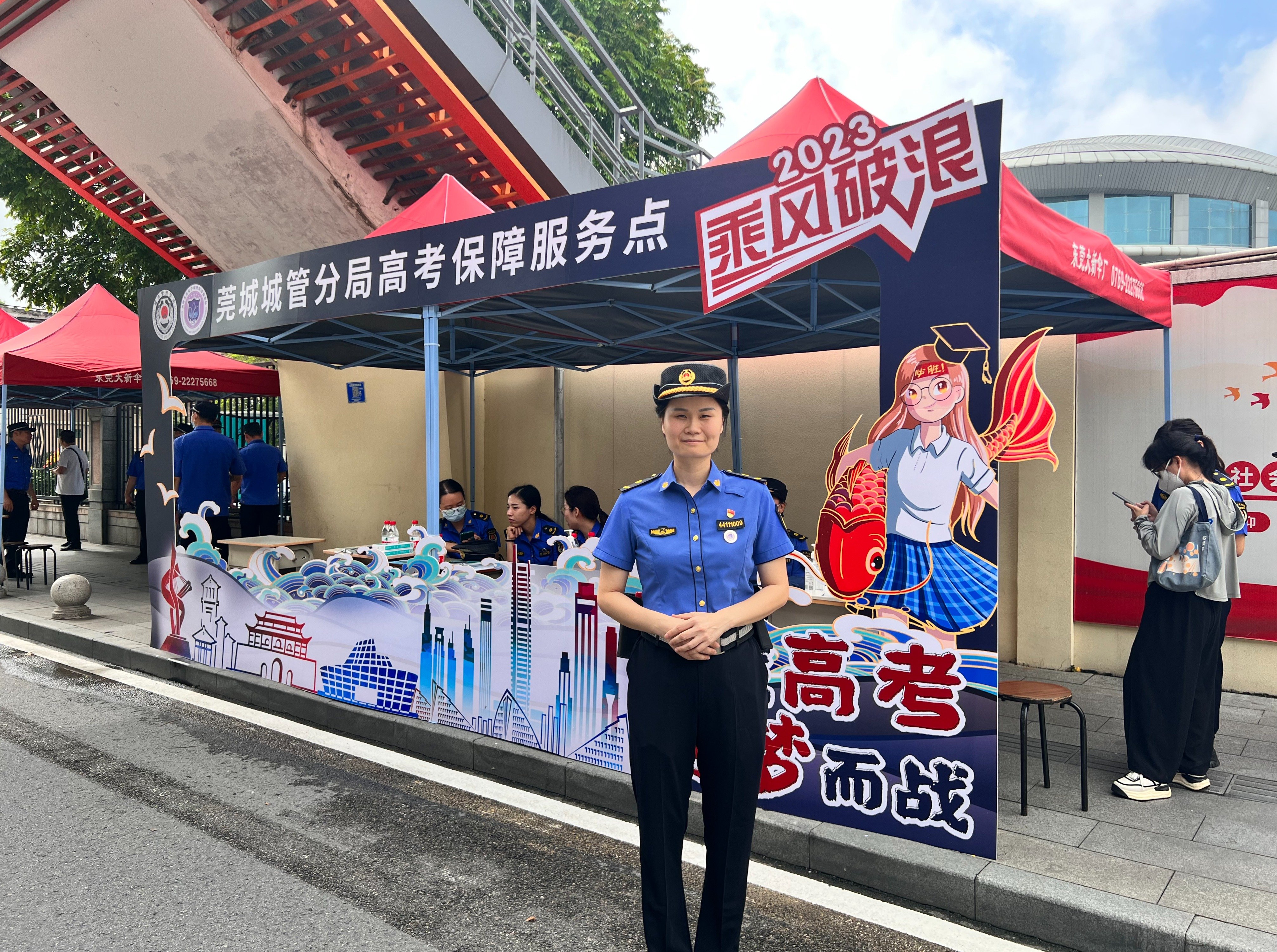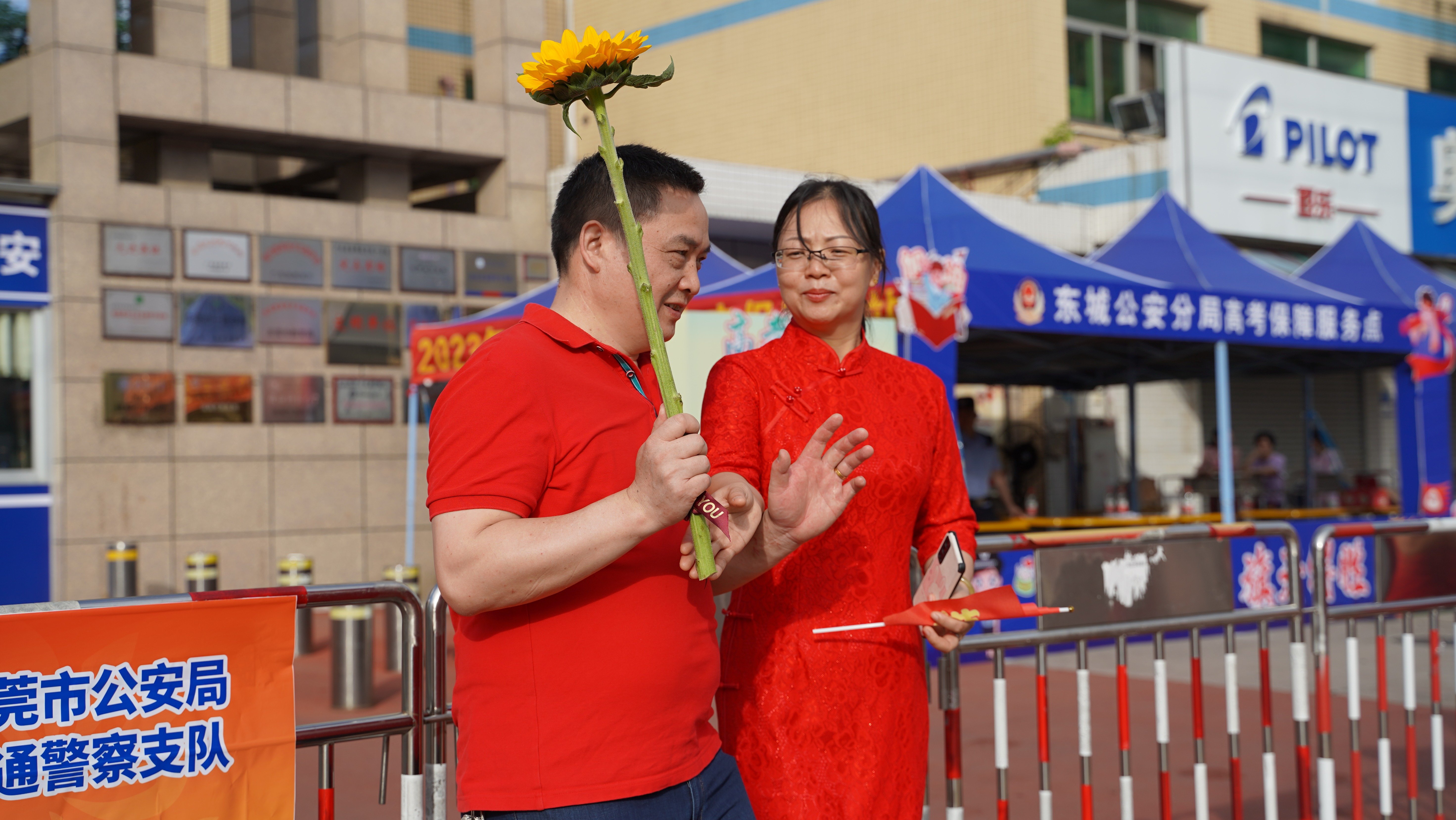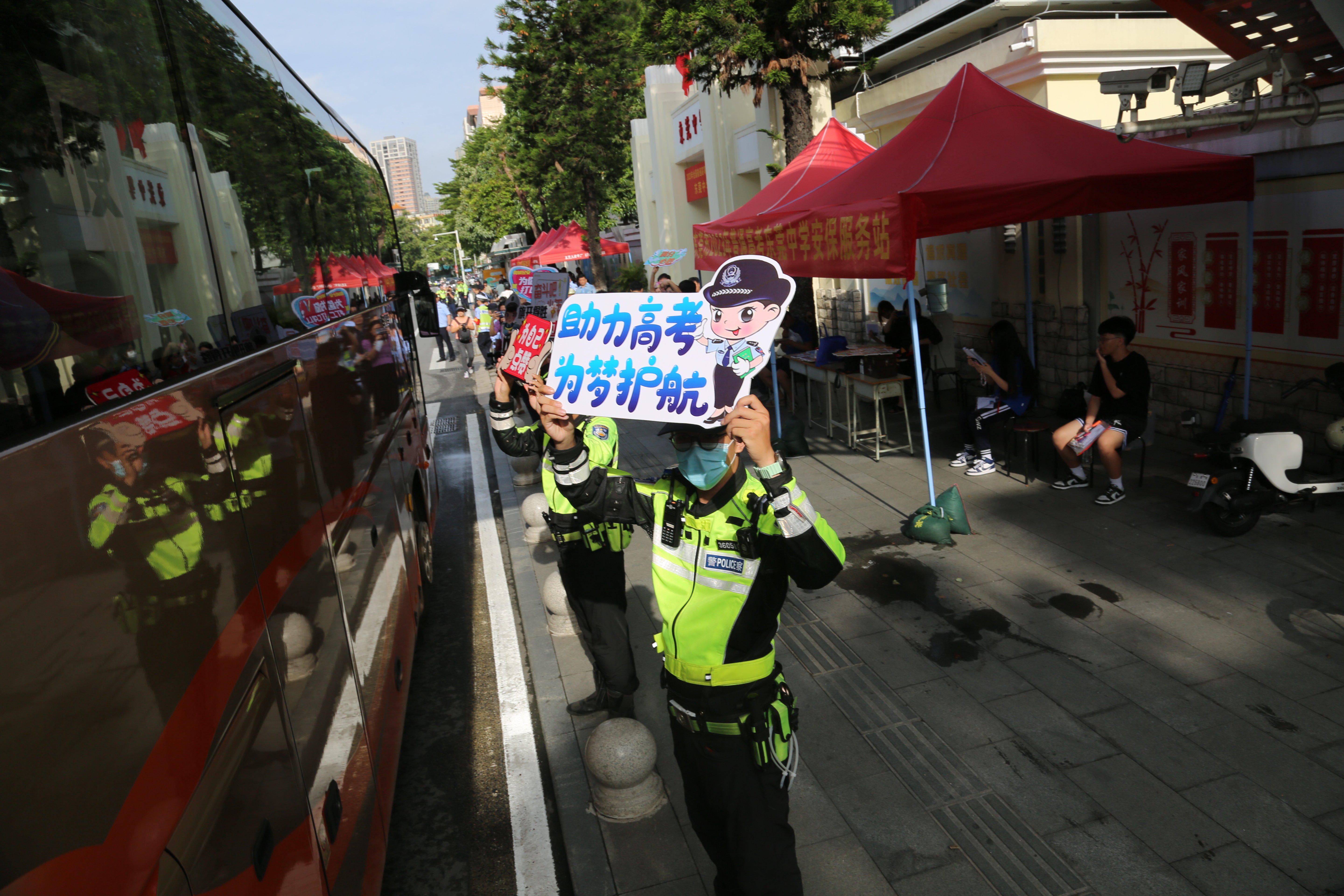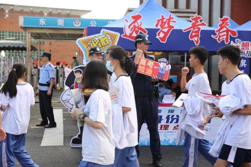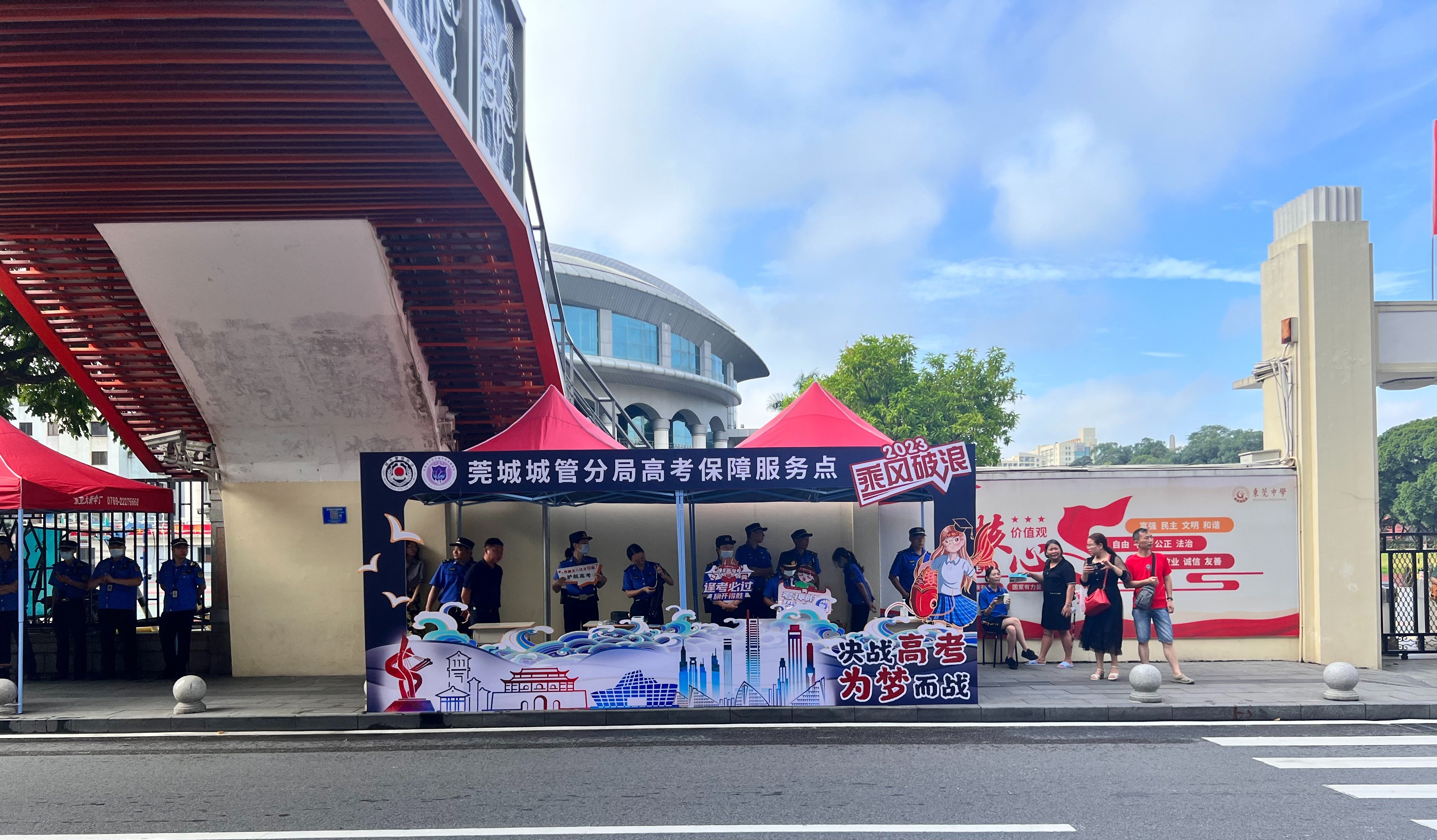 在考点现场,还有东莞市公安系统、东莞市城管系统等设立的“爱心助考站”,为考生助威打气、提供急需物资。