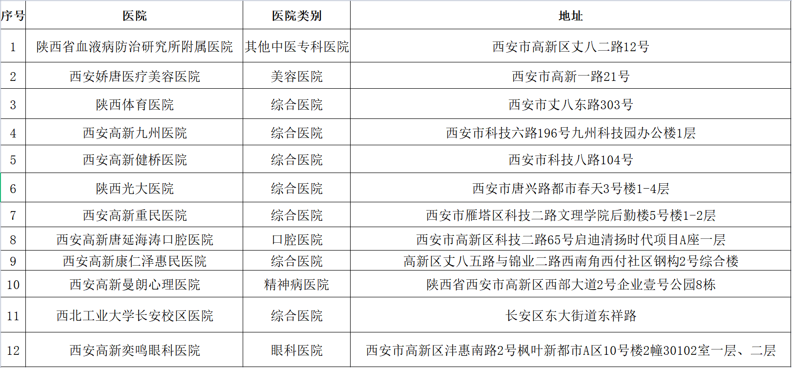 除三级医院外,高新区还拥有陕西省血液病防治研究所附属医院、西安娇唐医疗美容医院、陕西体育医院等12家综合或专科医院。