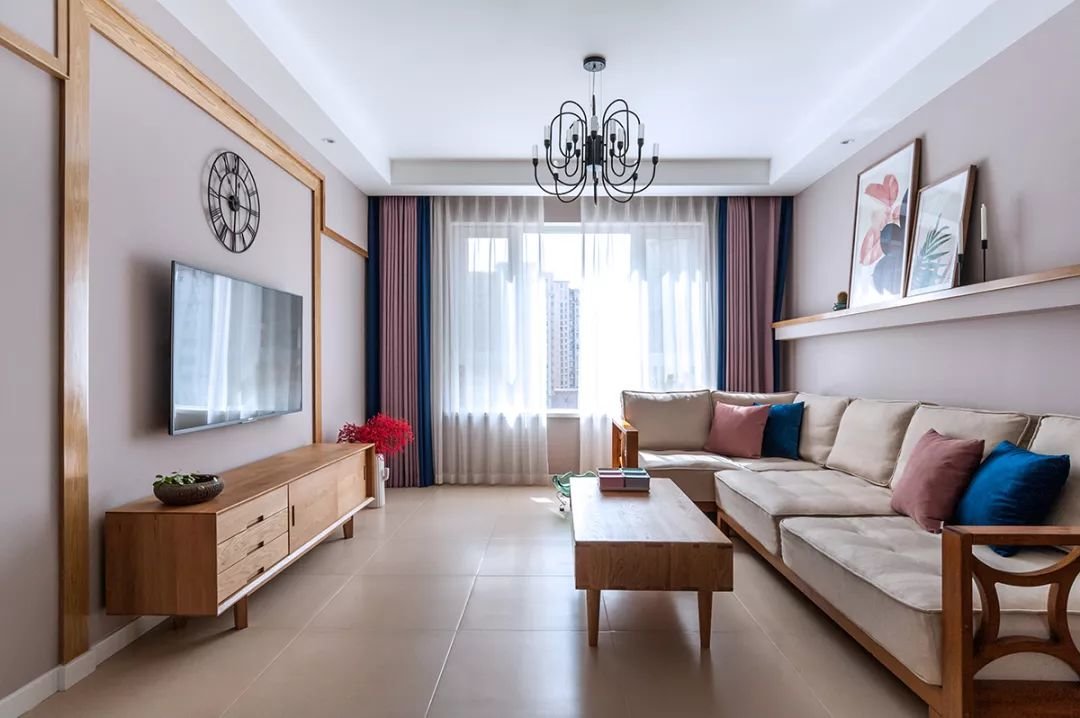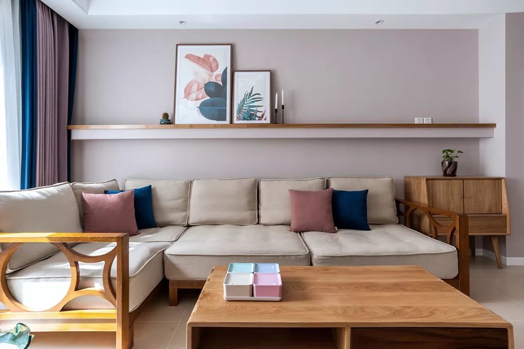 ▲实木框架+米白色的布艺坐垫沙发,布置蓝色与粉色抱枕,沙发后装一块搁板,摆上森系装饰画,让空间充满清新文艺与舒适的氛围感。