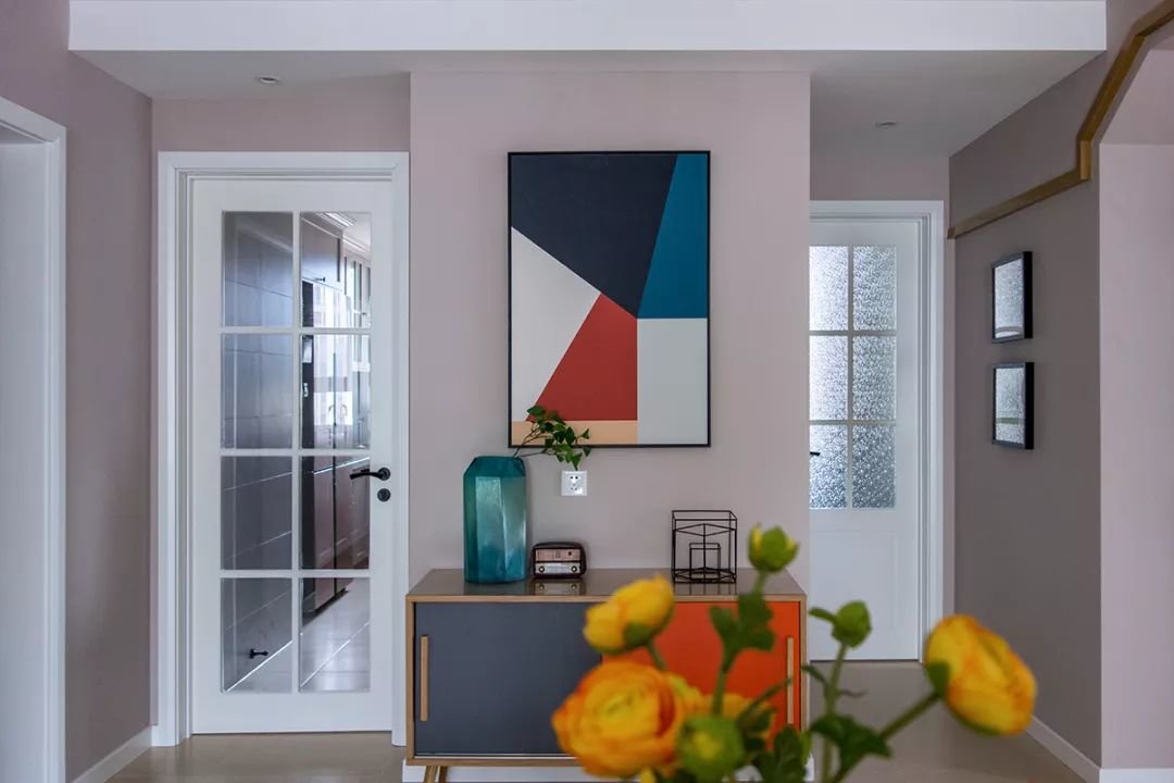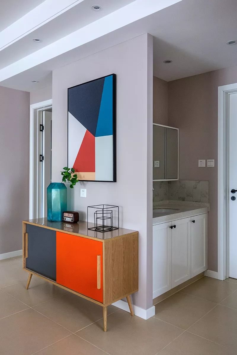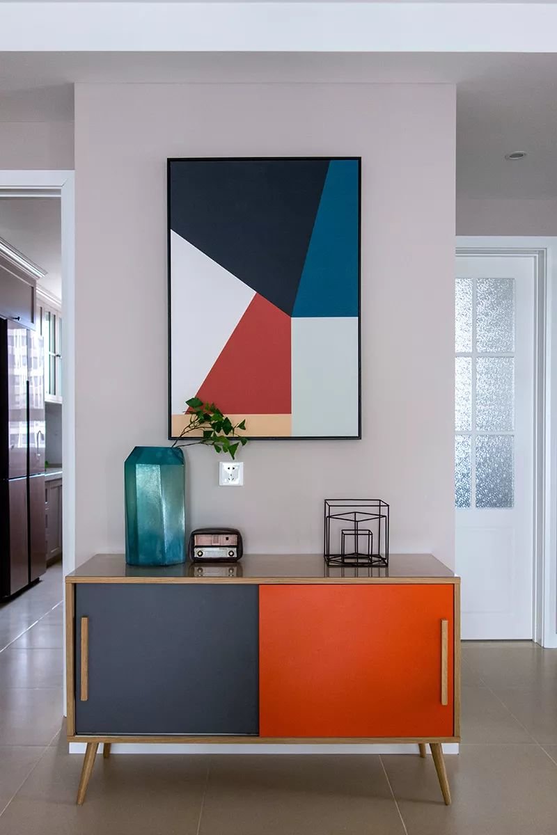 ▲实木端景柜以红黑配的柜门,布置上蓝色花瓶、铁艺架装饰,后方墙面挂一幅蓝红白色的几何图案装饰画,使得空间充满时尚优雅的气质感。