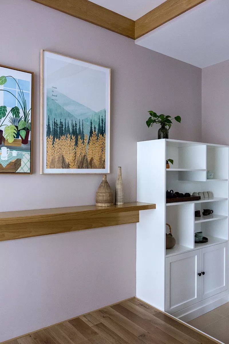 ▲原木色的隔板架,摆上禅意精致的花瓶,还有绿植点缀装饰,使得空间充满清新惬意的画面感。