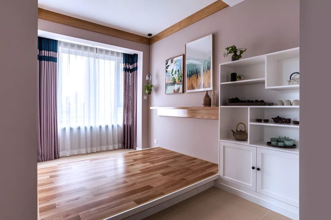 ▲次卧以抬高地台区分休闲区与动线,装一个矮柜,矮柜以开放+封闭柜格的组合,在加入森系装饰画、绿植的点缀,让空间充满清新文艺的氛围。