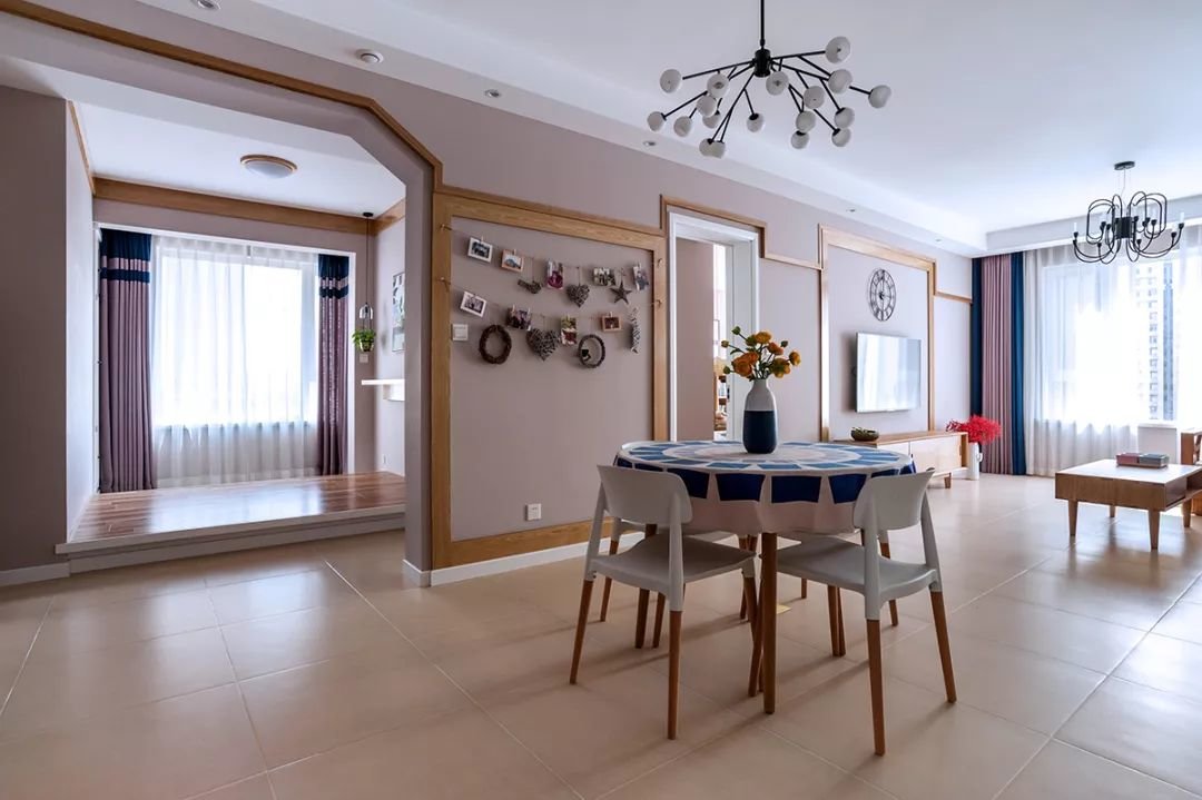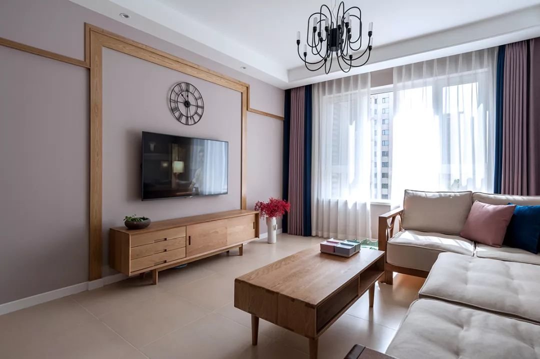 ▲为了打造一个简约而不失精致的电视墙,设计师采用了乳胶漆和木质框造型的搭配。暖紫灰色的乳胶漆,营造出清新自然的氛围,而木质框的线条简单流畅,增强了整个电视墙的层次感。在电视机上方,设计师还特意加挂了一款极简的时钟。这款时钟不仅能够让整个空间保持对称美,还能够让人们在看电视的时候可以看时间,也提高了空间的实用性和舒适度。