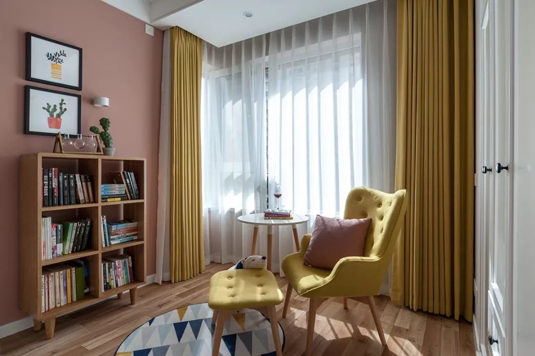 ▲。黄色窗帘与休闲凳组合,在自然的光线下,呈现出一种暖意漫漫的格调分氛围,布置书架与小桌椅,让这个角落成为午后阅读的惬意时光。
