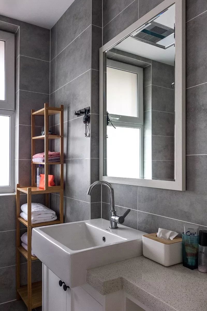 ▲卫生间在有限的空间,以半嵌入式洗手盆+窄台面的设计,角落还布置了成品收纳架等设计,也让空间布置成实用方便。
