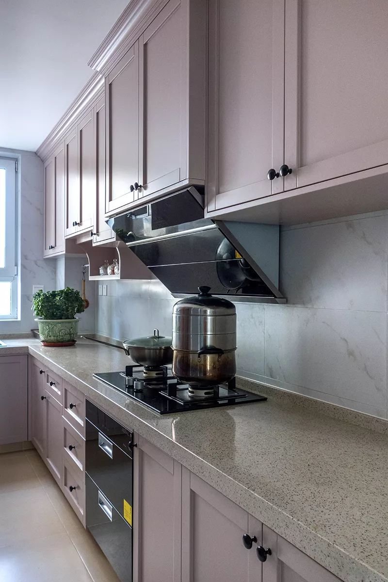▲紫灰色的定制橱柜,以L字形的操作台布置,为主人打造了一个方便实用的烹饪做饭空间。