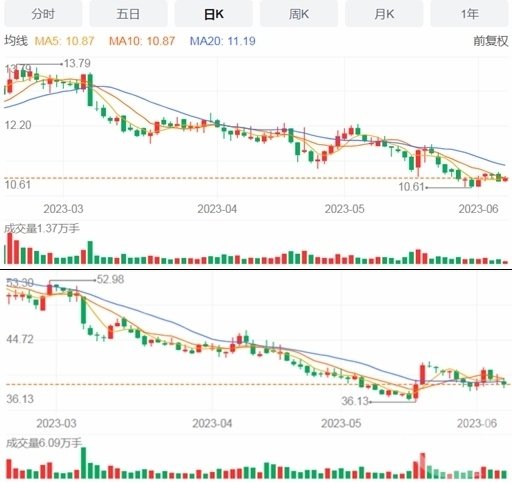 ▲煌上煌(上)和绝味食品(下)两股近期走势。 图片来源/百度股市通