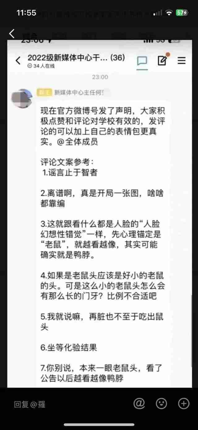 事件发生后,有学生透露,该校辅导员曾开会提醒在校学生禁止在网上发布任何关于上述事件的相关言论。有媒体报道称,该校教职工疑似要求学生在其官微下刷屏控评。截图显示,在一个名为“2022级新媒体中心……”的群聊中,群主(备注为新媒体中心主任何某的人)称,“现在官方微博发了声明,大家积极点赞和评论对学校有效的,发评论可加自己的表情包更真实。”随后,上述工作人员提供了数条“评论文案参考话语”。