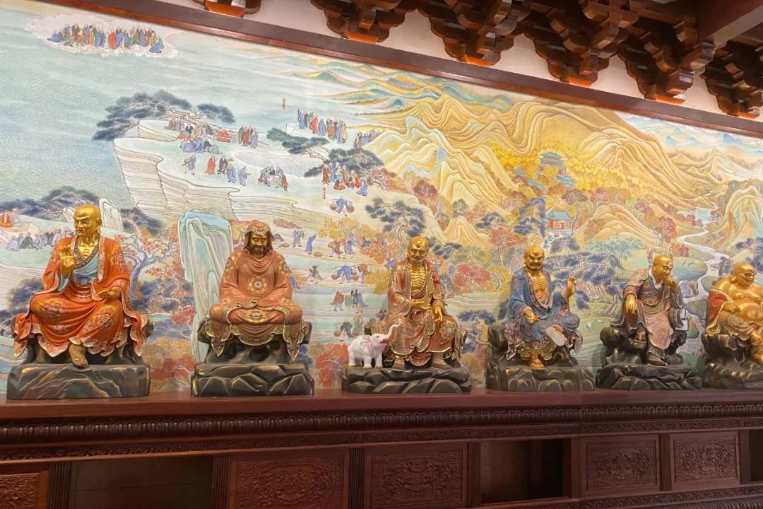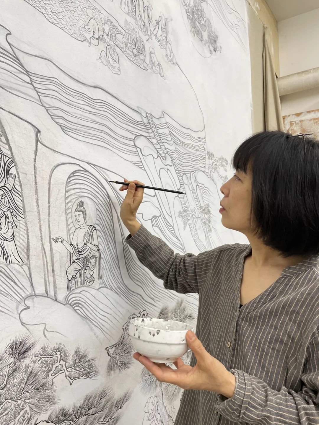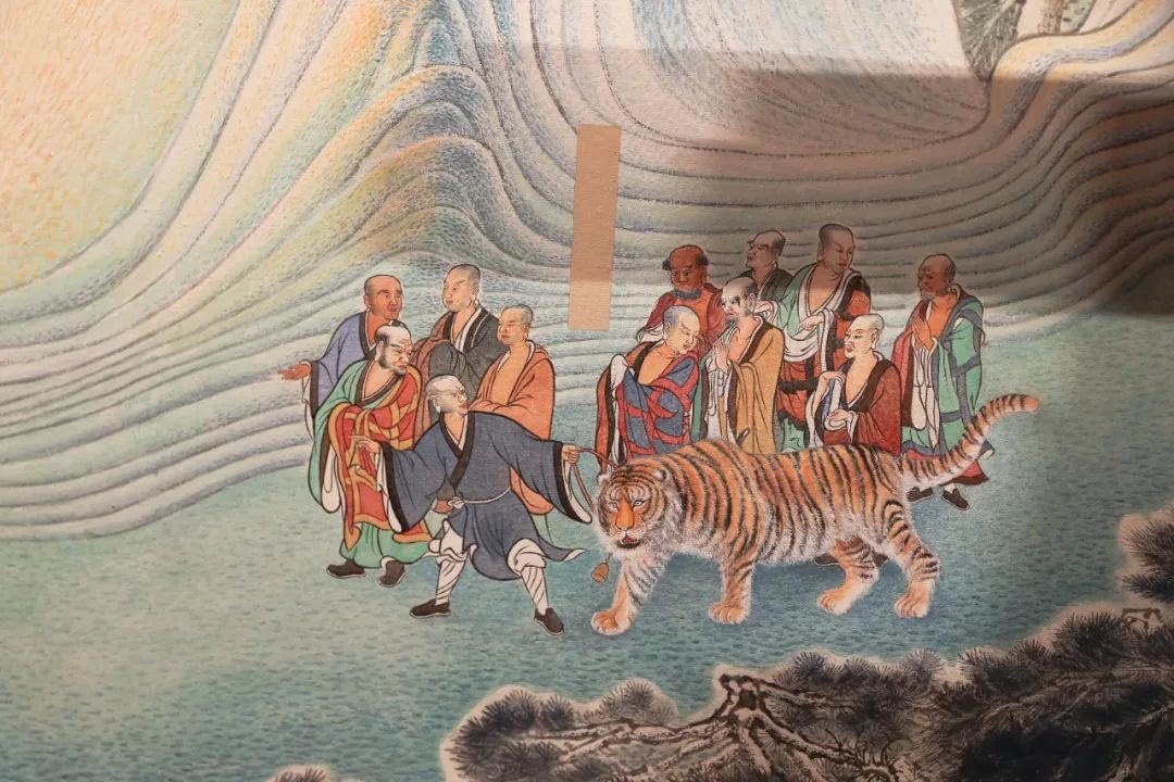 “每日看资料,静坐观想,有一天梦中出现五百罗汉的场景,山水、林木、祖师、罗汉如同电影一幕幕展现,醒后拿着毛笔直接在画布上创作,画了近十天,两幅壁画小稿完成。包括五百个人物和山水树木的布局,一气呵成,我自己也感到不可思议。想想理海法师讲缘,这些帮助加持,我们的朋友都与佛有缘,在此感恩众多有缘人给我们的帮助。”