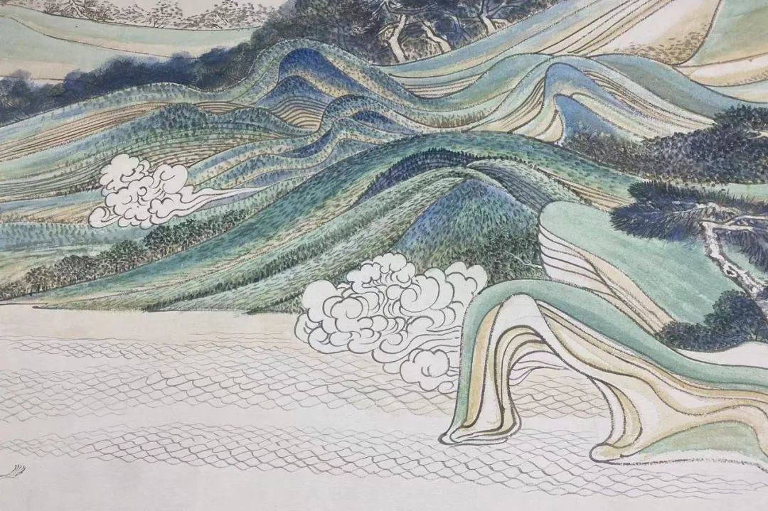 说到皴法,在青绿山水中并不多见,大部分青绿画法都是先勾后染,先上暖色,上石绿,再上石青就完成。唐代李昭道,宋代王希孟,在染色上有一点披麻皴,非常弱。卷轴画青绿山水,由于画面尺幅因素,视觉效果仅靠矿物色厚重色彩的冲击力就足够,所以少皴或不皴是可以的。但是壁画面积大,如果只染不皴,就会空洞单调。应该用什么皴法来表现?古人总结画山水的技法,只皴法就有几十种,而这些皴法主要针对水墨山水画,真正用在青绿山水里的少之又少,因为古人画画讲究“色墨不兼”。古人认为色与墨放在一起互不协调,如果用厚重的矿物色去染皴好的山石树木,画面会脏;如果在染好的青绿上再使用皴法,墨又不能很好的与颜色融合。团队在实践过程中发现,画青绿山水可以用色彩来皴山石,色色相兼,先把底色染好,再用比底色重的颜色来皴,色彩层次多了,石头的质感也表现出来了。更重要的是画面干净,符合神仙世界的意境。至于皴法,画的时候根据实际情况随类使用。