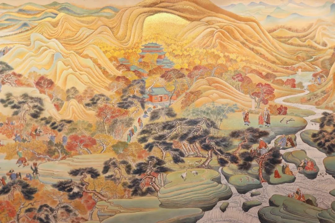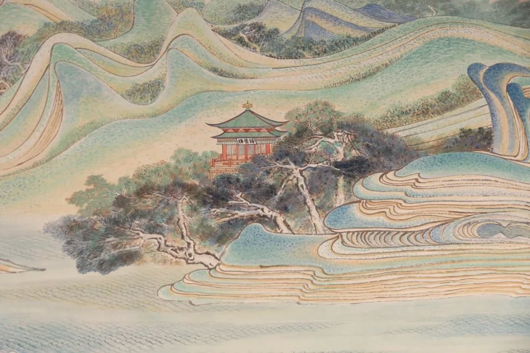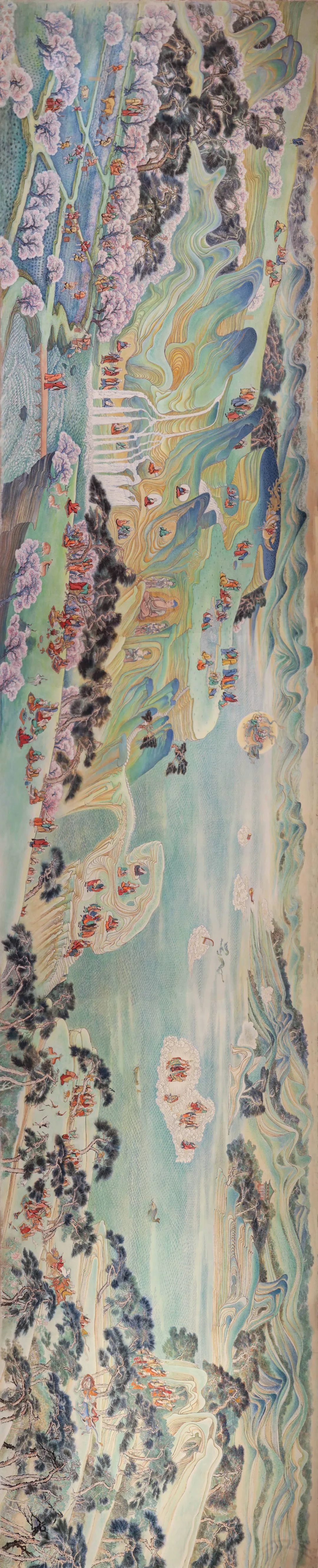 其次是色彩冷暖关系的设计,大殿内饰以暖色系为主,壁画如果用暖色为主调,很难拉开与内饰的距离,丧失了深远的空间感。如果完全采用冷色调,又会因为对比太大产生不协调之感,把握好冷暖的尺度是关键。古代壁画中的色彩方案少有能直接照搬的范本,再看历代青绿山水作品倒是有不少启发,如北宋王希孟的《千里江山图》,大青绿从色彩学角度看,以冷调为主,也符合神仙世界纯净琉璃碧玉的感觉。但壁画的观看环境与卷轴画不同,它必须要考虑大殿里的陈设,为了解决冷暖平衡的问题,创作者选择了“整体偏冷,局部加暖”的思路,也就是说:大的山脉和水域,以冷色为主,不同季节局部加暖色,如春天山花,秋天层林及果实。