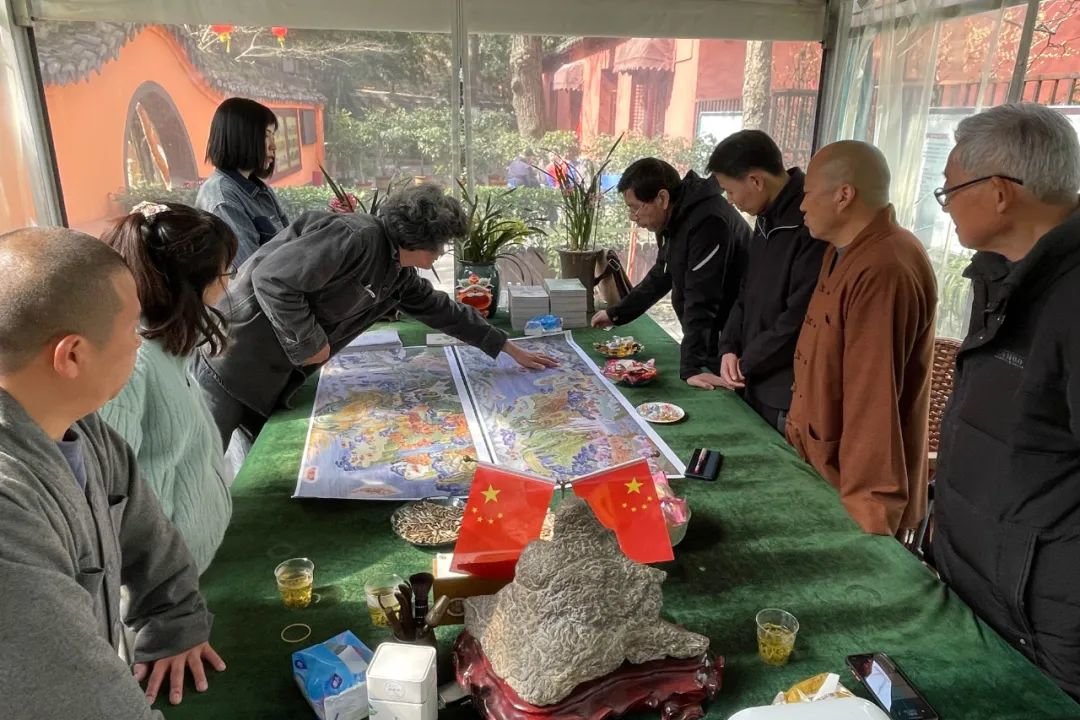在壁画稿创作过程中,理海法师常请相关专家(主要有法度师父、葛长森先生、董群教授、于向东教授、王辉博士等)参与审稿工作。理海法师提议壁画里可以表现一些与清凉寺有关的典故内容,大家纷纷表示赞同。董教授建议,可以把有禅宗代表性的事物设计到壁画里,比如破头山,也可以把清凉寺画进去,让人有亲近感。于向东教授说,龚贤当年就在清凉寺画画,他的画室叫“扫叶楼”,龚贤是一个文化符号,可以在画面中表现扫叶楼的景象。长森老师说,他编写的《清凉源流》里面有大量关于清凉寺的典故,他会帮助整理其中有代表性的内容,再一同讨论哪些适合在壁画中表现。数次的审稿会,创作团队收获很大。挖掘本寺的历史典故,就能形成本寺的壁画特色。虽然画的是五百罗汉,可是增加了清凉寺的内容,就能有别于其他地方的五百罗汉,形成清凉寺的特色。