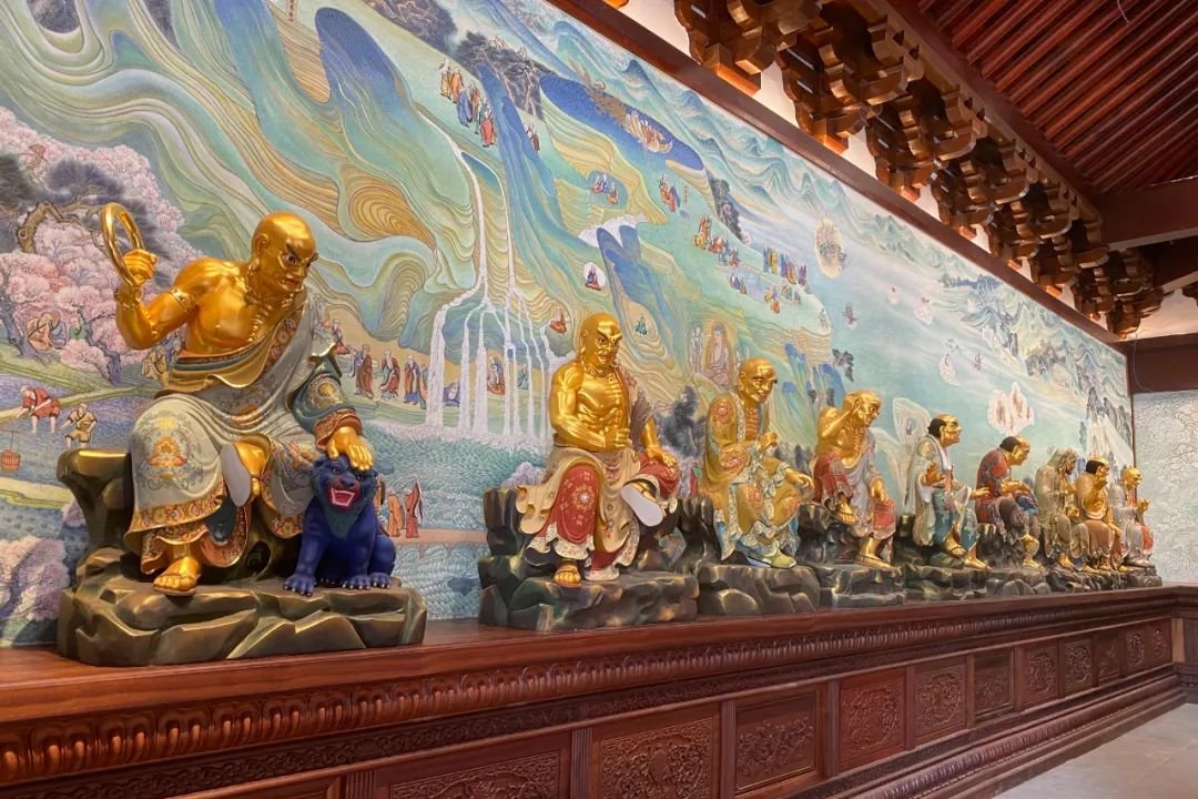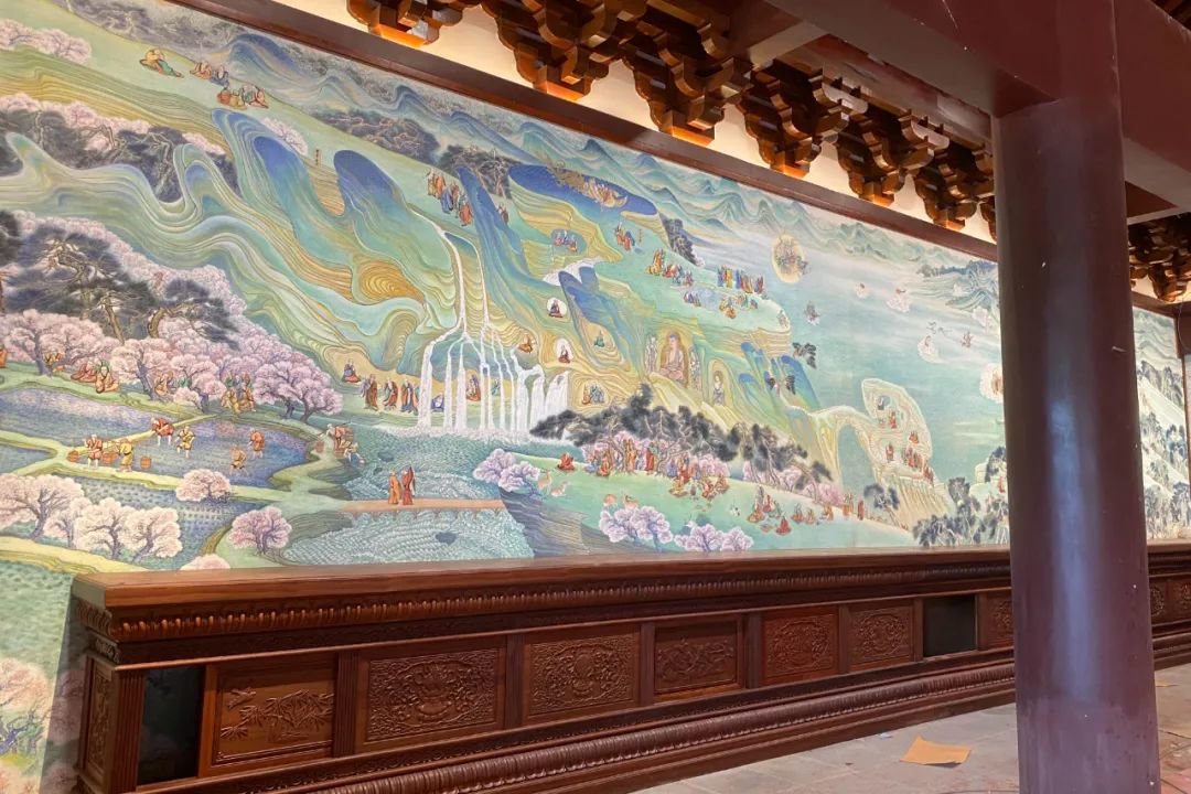 南京清凉寺坐落于清凉山公园内,是禅宗法眼一脉的祖庭。由于地处中心城区,所以寺庙建筑规模并不算大。新的大雄宝殿于 2022 年完工,大殿东西两侧的墙上需要绘制壁画。