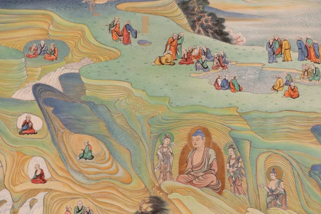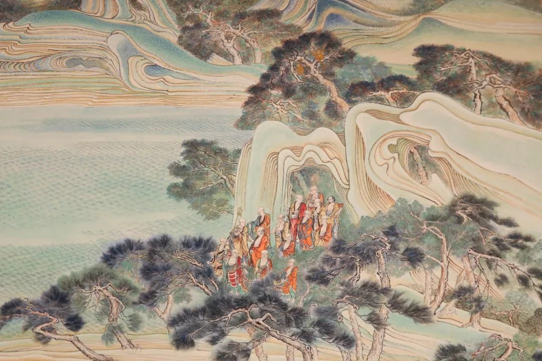 扁长的画面在中国传统壁画中并不常有,这种比例多见于卷轴画,观者可以慢慢打开,分段欣赏。而壁画几乎是一眼看到全貌,所以对于整体构图的要求很高,同时又要做到精致细节。影响构图的还有一个因素——壁画前的十八罗汉塑像,因为最终呈现时壁画和塑像是紧靠在一起的,这一点也必须考虑进去。